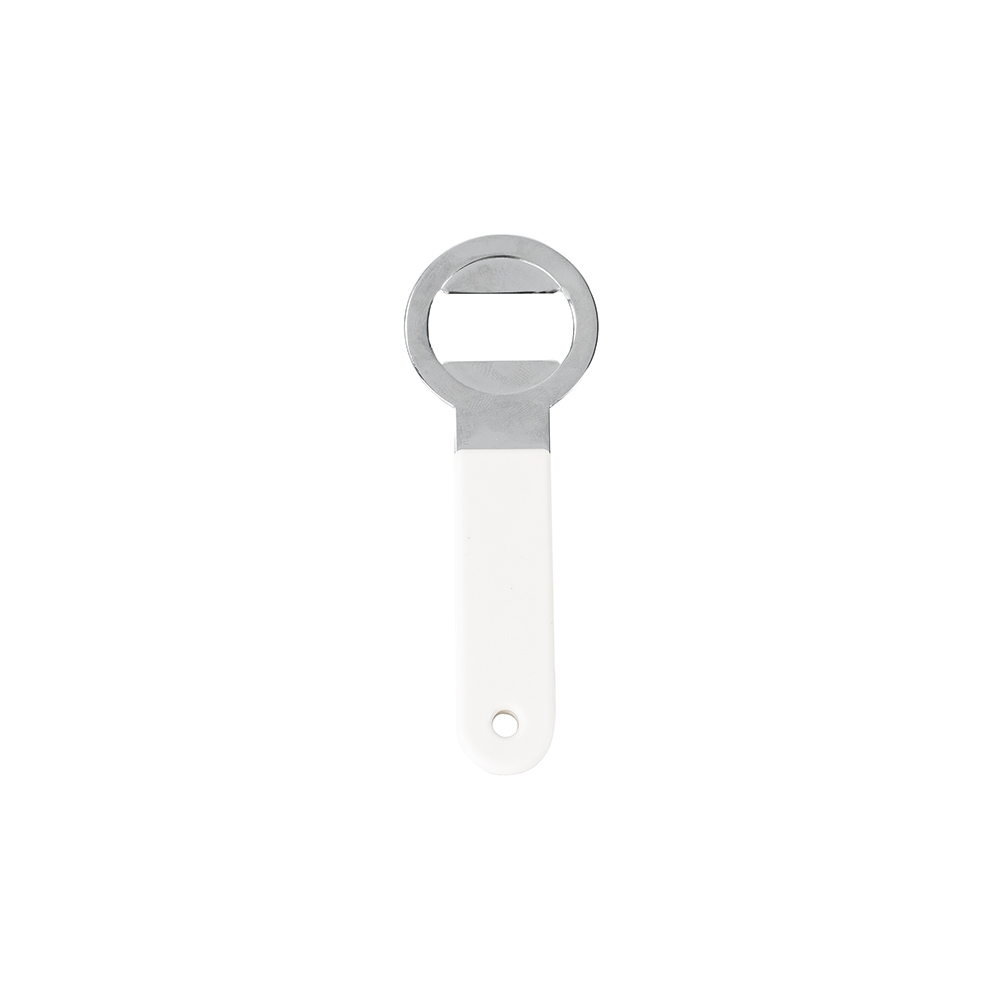 Abridor de garrafas com argola em aço carbono e cabo com revestimento em plástico ABS.