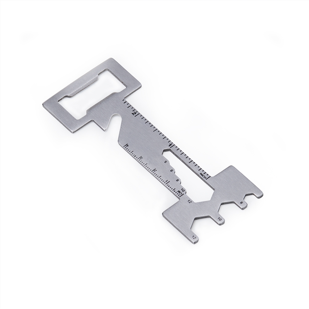 Abridor de garrafas metálico multiferramentas, possui réguas com unidades em centímetros e polegadas, 5 chaves de boca, 3 chaves hexagonais e faca de cordão.