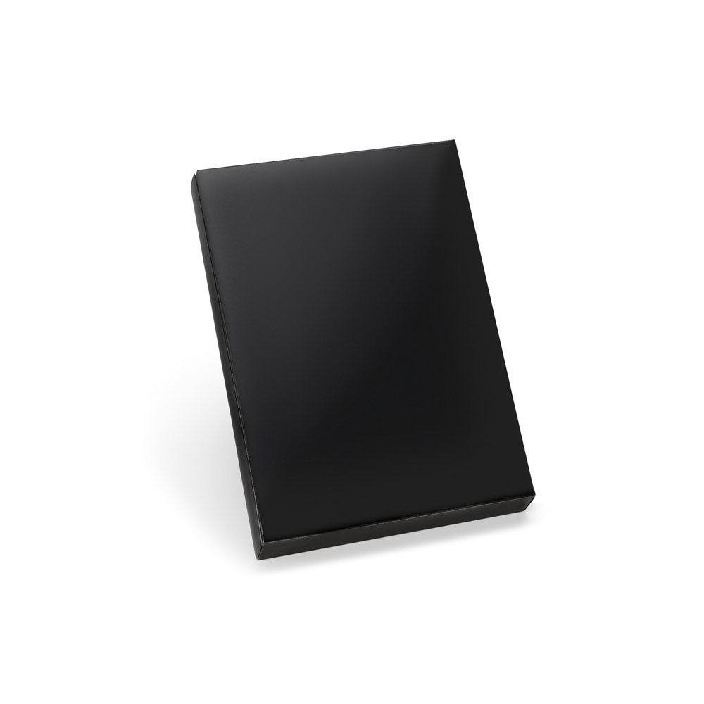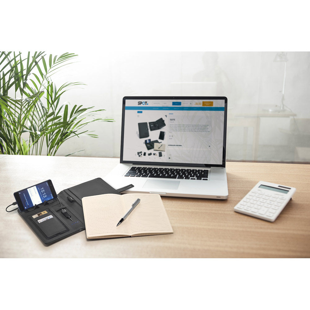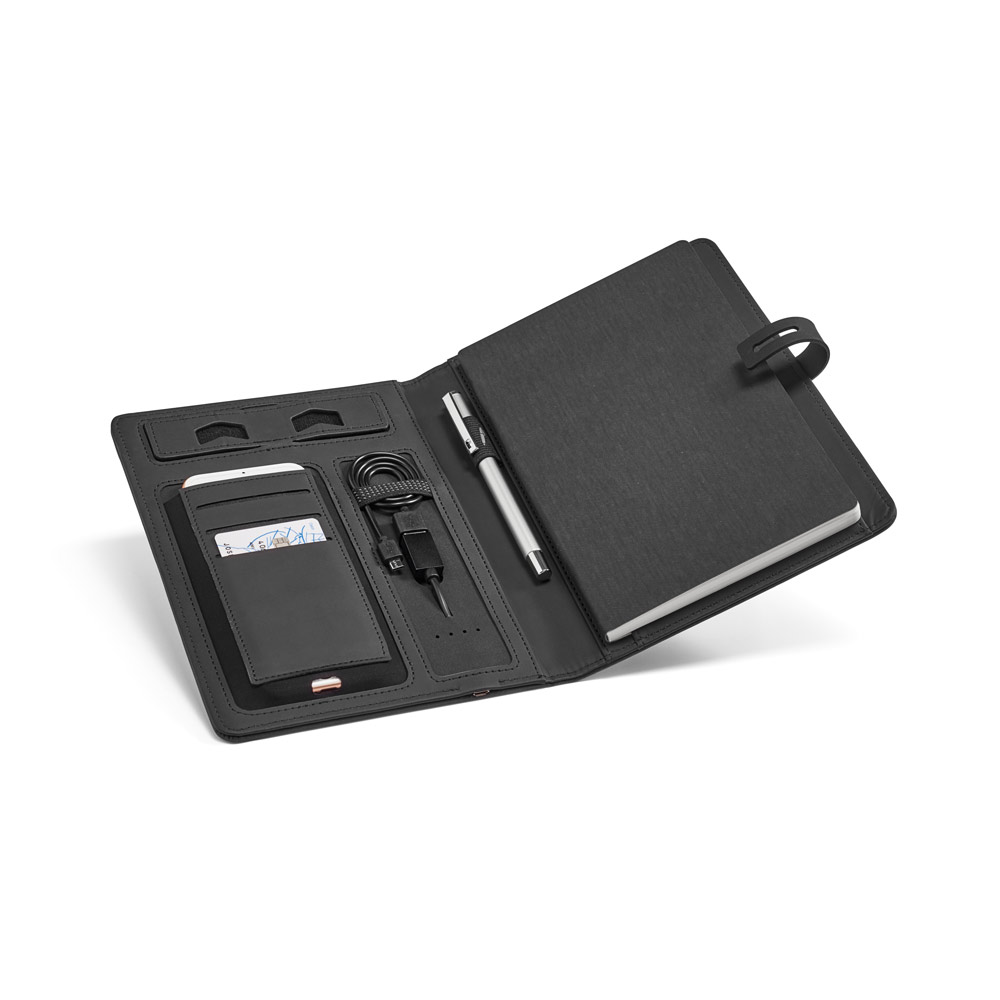 Pasta A5 em c. sintético com bateria portátil embutida (lítio). A bateria tem capacidade para 4’000 mAh, tempo de vida ≥ 500 ciclos com entrada/saída 5V/1A e cabo USB-C para carregar a bateria. No interior, contém um caderno removível com 128 páginas pautadas de cor marfim, um suporte para esferográfica (não inclusa), elásticos para organização e suporte para smartphone. No exterior, uma placa com acabamento emborrachado, LED interior e botão on/off. Fornecida em caixa presente. 165 x 225 x 25 mm | Placa: 55 x 35 mm | Caixa: 180 x 240 x 35 mm