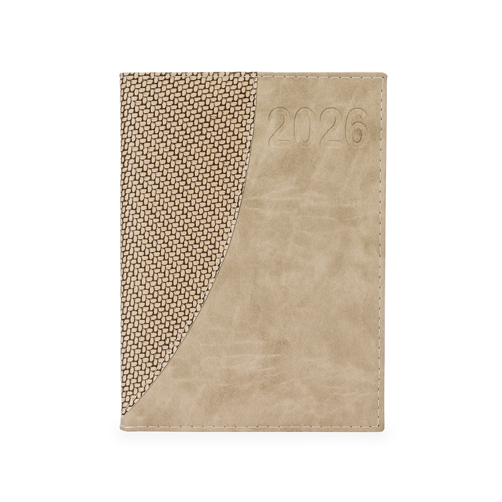 Agenda diária 2026 em couro sintético com detalhes texturizados e marca-páginas em fita de cetim. Contém páginas dedicadas a dados pessoais, calendários de 2025 a 2027, lista de contatos, planejamento diário e mapas.