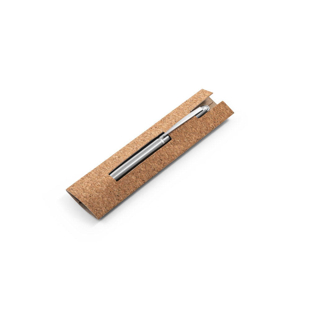 Esferográfica com corpo em aço inox 53% reciclado. A esferográfica tem clipe, mecanismo twist e escrita em preto até 1.5 km. Fornecida numa bolsa presente de cortiça. Esferográfica: ø11 x 137 mm| Bolsa: 155 x 40 mm