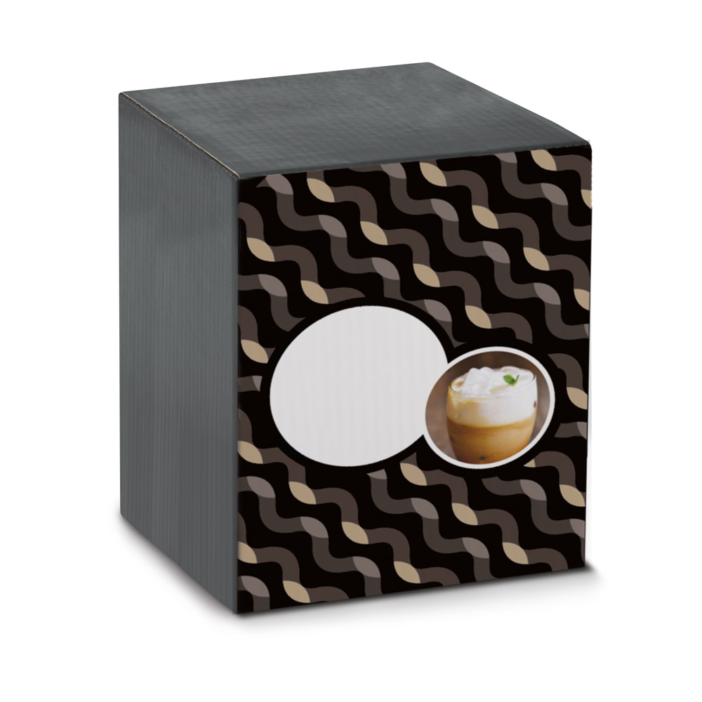 Copo em vidro borossilicato com parede dupla isolada a ar. Capacidade até 220 mL. Fornecido em caixa presente personalizável. Certificação EU Food Grade. ø80 x 86 mm