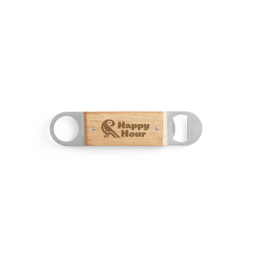 Abridor de garrafas em aço inox com corpo em madeira de faia. Distintivo dos restantes por conter um abridor de um lado e uma argola para facilitar sua arrumação. A cor e o resultado da impressão nos materiais naturais pode variar entre produtos. 40 x 180 x 10 mm