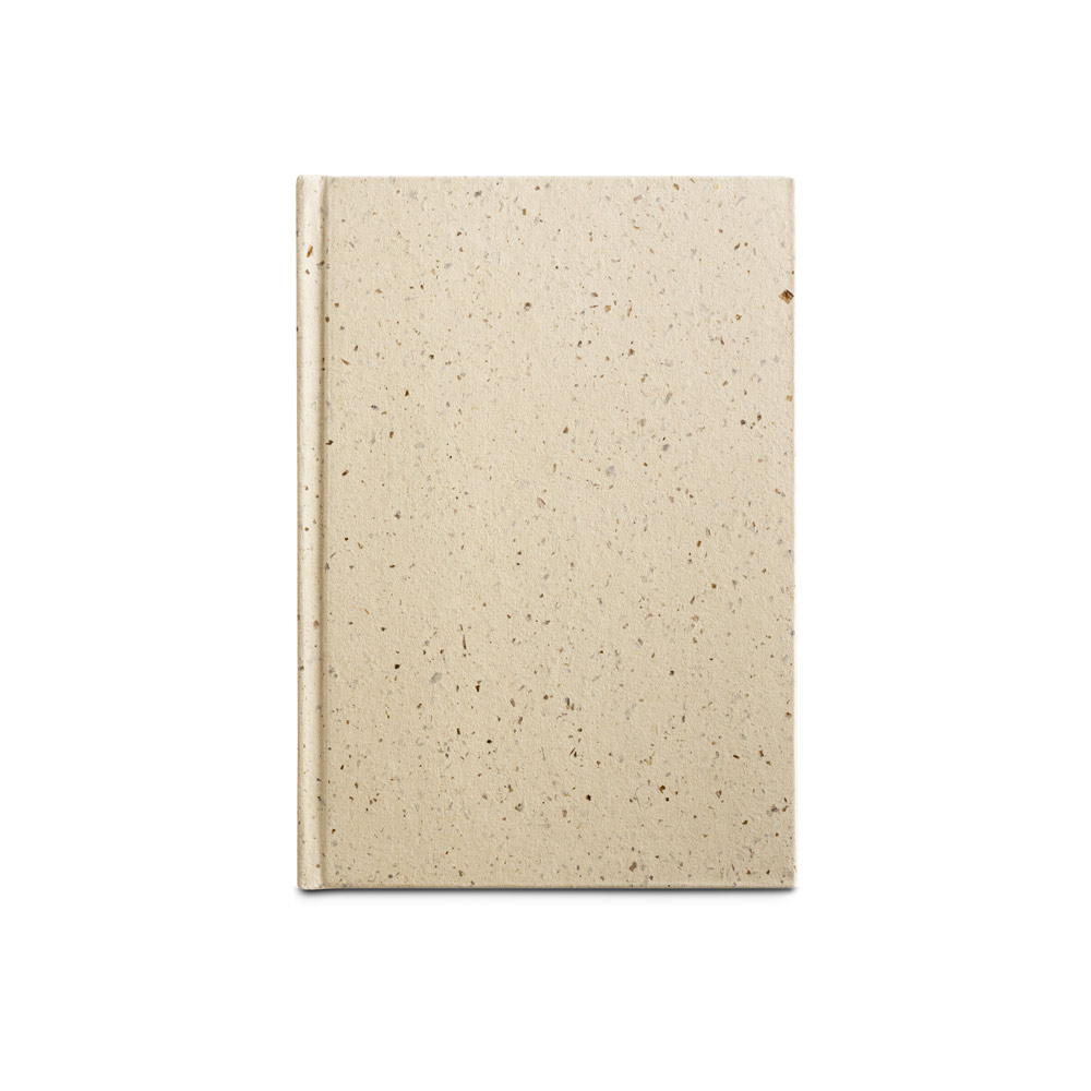 Caderno A5 de capa dura em resíduos de cevada (25%) e pedaços de algodão reciclado (75%). Contém 160 páginas pautadas de papel 100% reciclado. Um caderno que se distingue por dar uma segunda vida a materiais que podem ser reciclados. 145 x 205 mm