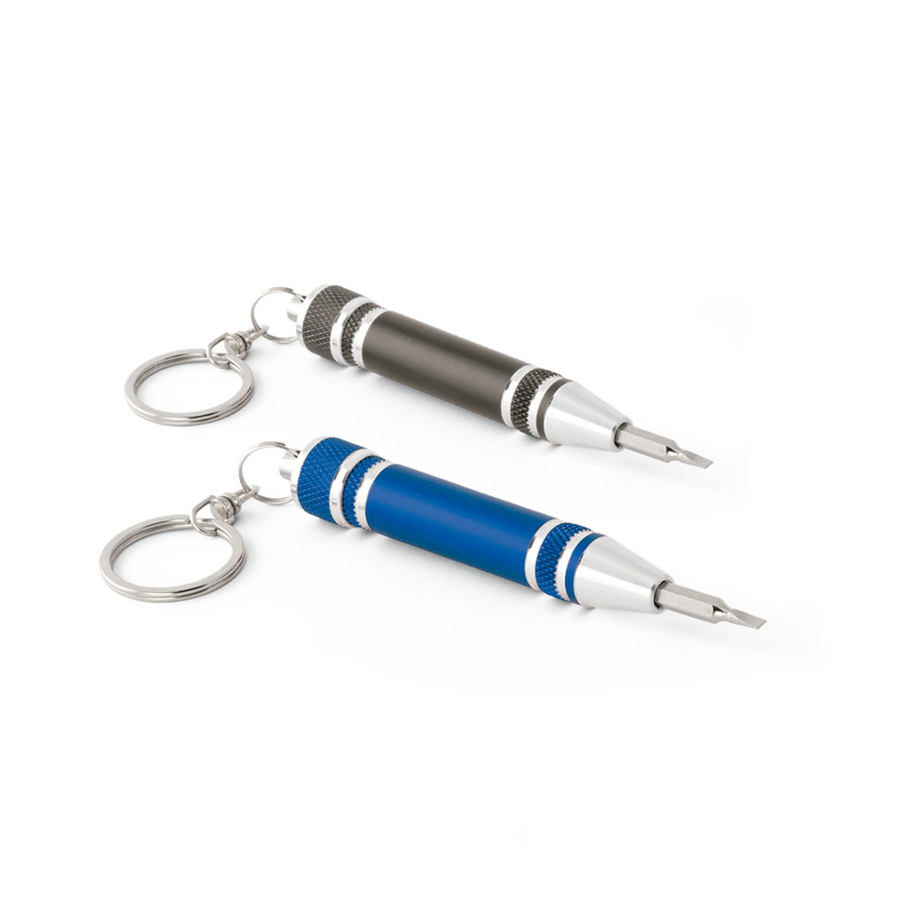 Conjunto de mini chave de parafusos em metal com 3 pontas diferentes removíveis, tendo opção de guardar as peças no topo do corpo com tampa. Chaveiro incluso. ø13 x 75 mm
