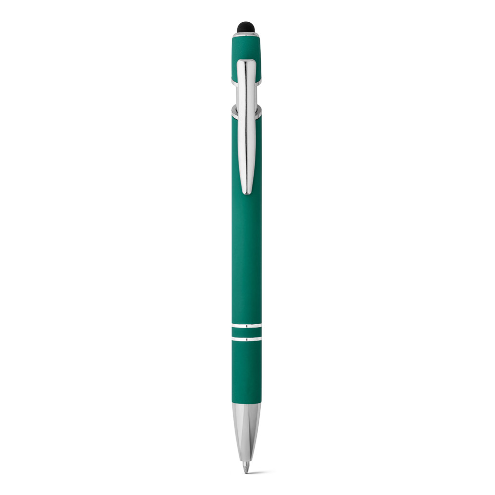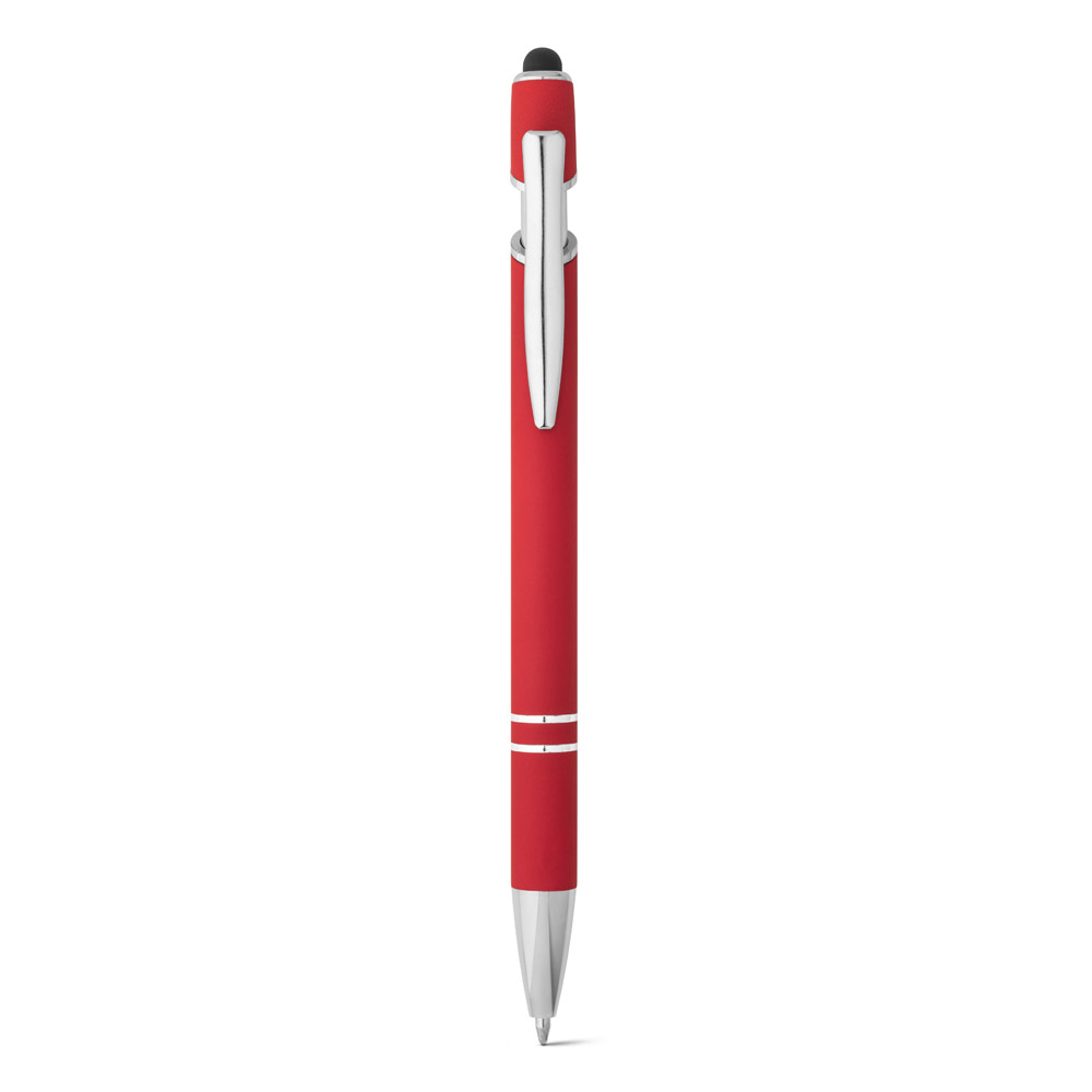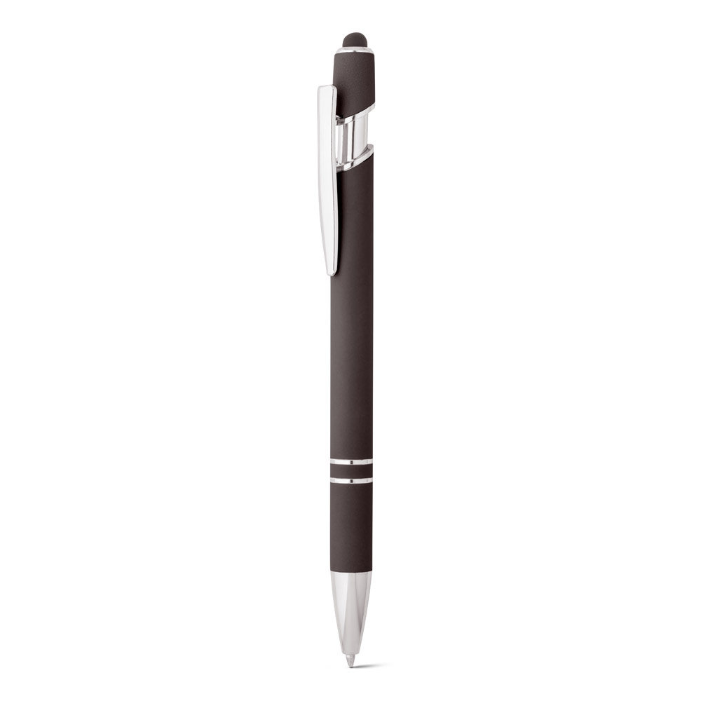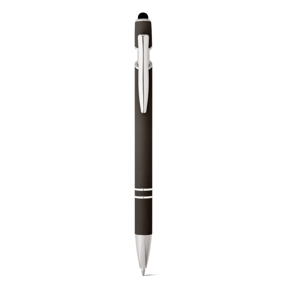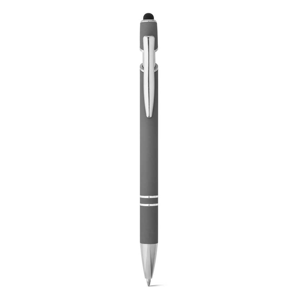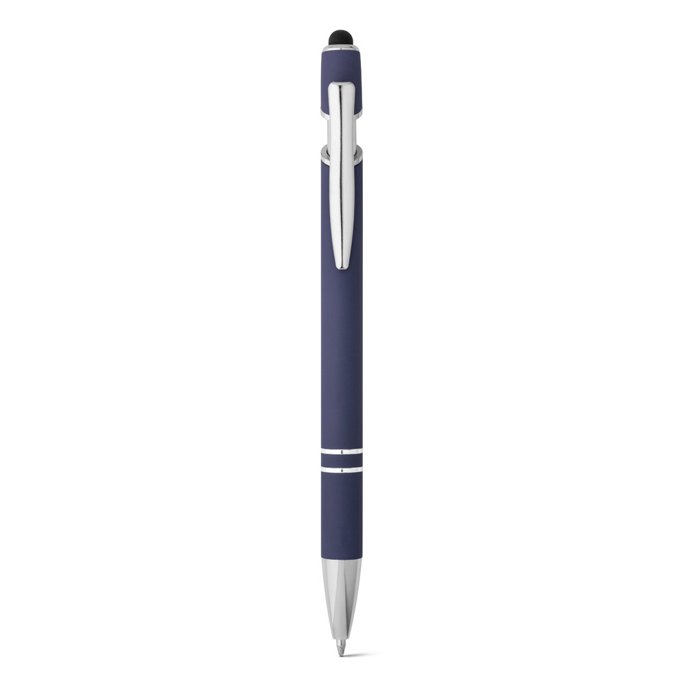 Esferográfica em alumínio com acabamento emborrachado. A esferográfica tem clipe em metal, ponteira touch no topo e escrita em azul até 1.5 km. ø10 x 143 mm