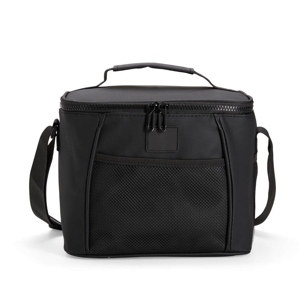 Bolsa térmica confeccionada em poliéster mesclado com PVC impermeável, fechamento em zíper e capacidade máxima de 10 litros. Conta com revestimento térmico em PEVA atóxico, o que oferece maior tempo para a conservação da temperatura de alimentos e bebidas. Apresenta placa emborrachada para personalização, dois bolsos abertos em tela de nylon com elástico, além de alça de mão e alça transversal.