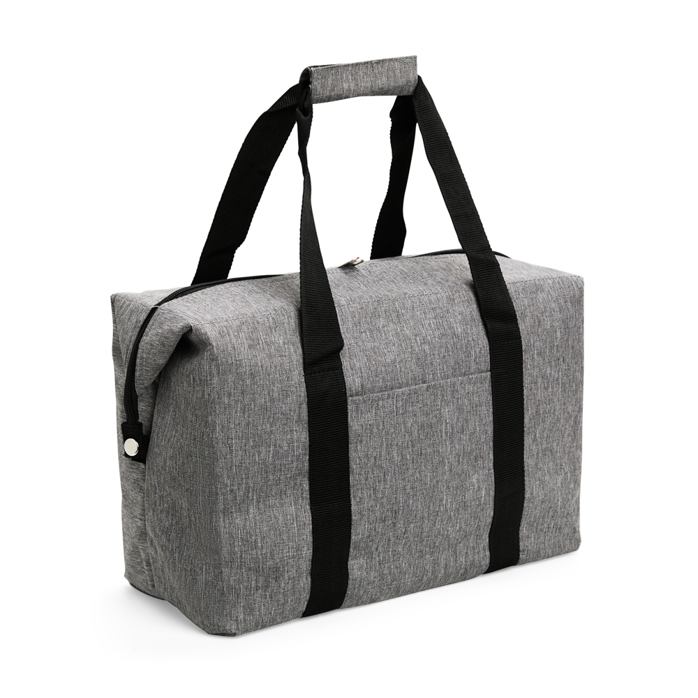 Bolsa térmica confeccionada em Oxford resistente à água, fechamento em zíper e capacidade de até 25 litros. Possui revestimento térmico interno em folha de alumínio, botões laterais de metal para junção, bolso externo e alças de mão em nylon com suporte de união por velcro.