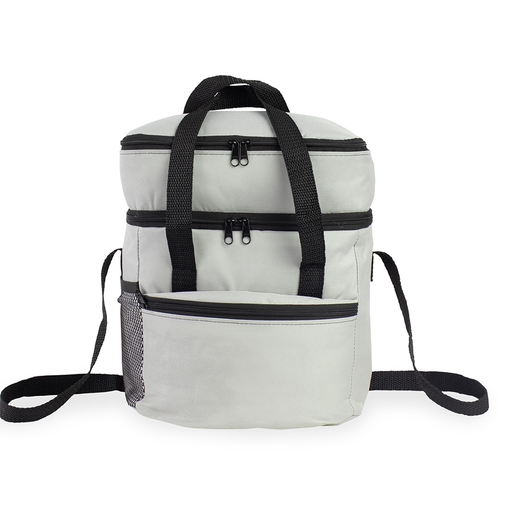 Bolsa térmica confeccionada em poliéster 600 impermeável, fechamento em zíper e dois compartimentos com capacidade para até 14 litros. Possui revestimento interno em laminado branco e bolso telado em malha. Conta ainda com bolso lateral em tela, bolso frontal com fechamento em zíper, duas alças de mão e alça transversal ajustável.