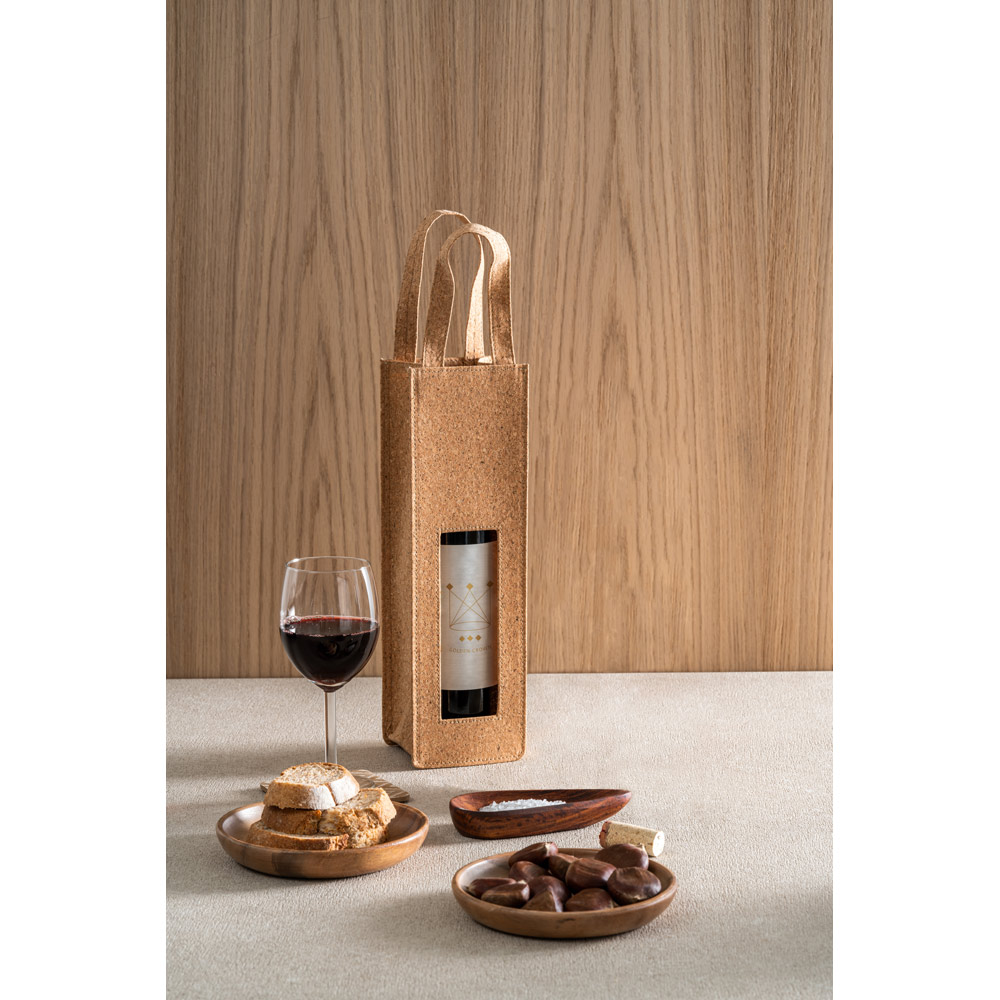 Sacola em cortiça para 1 garrafa. Sacola amiga do ambiente com 2 alças e janela na parte frontal, ideal para oferta. A cor e o resultado da impressão nos materiais naturais pode variar entre produtos. 100 x 330 x 100 mm