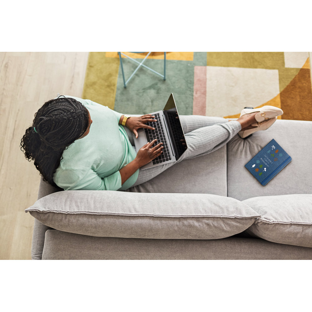 Caderno A5 de capa dura em tecido poliéster 100% reciclado (rPET). Contém 192 páginas pautadas em papel cor marfim, proveniente de gestão florestal sustentável, fita separadora, elástico e bolso em papel na parte traseira da capa. 140 x 210 mm