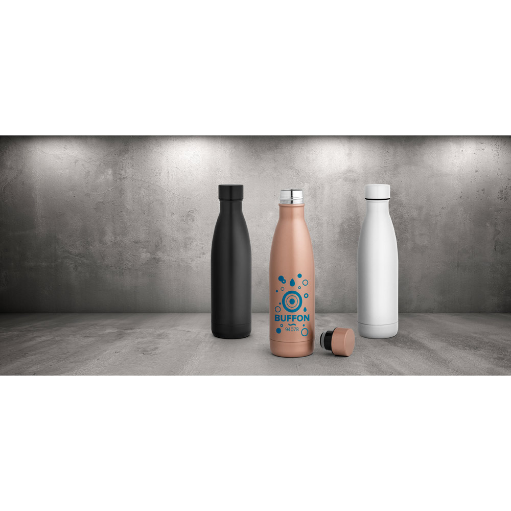 Garrafa em aço inox de parede dupla térmica, isolada a vácuo com tampa em aço inox. Capacidade até 500 mL. Mantém as bebidas quentes por 8h e frias por 24h. Fornecido em caixa presente de papel kraft reciclado. Certificação EU Food Grade. ø67 x 255 mm | Caixa: 75 x 75 x 275 mm