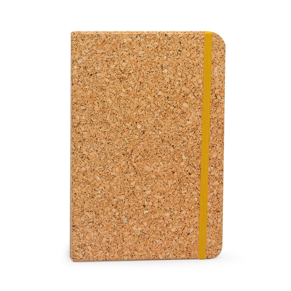 Caderneta em papel couche 150g, contém aproximadamente 72 folhas amarelas com pauta e 16 folhas sem pauta, marcador de página em cetim, elástico para lacre e compartimento em papel para documentos ou anotações.