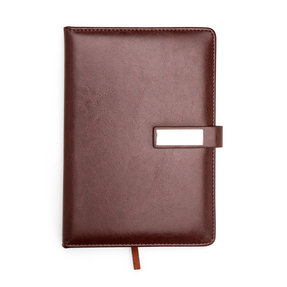 Caderneta com capa em couro sintético, fecho magnético, além de marca-páginas em fita de cetim. Possui aproximadamente 96 folhas marfim com pauta. Acompanha plaquinha fixa em metal.