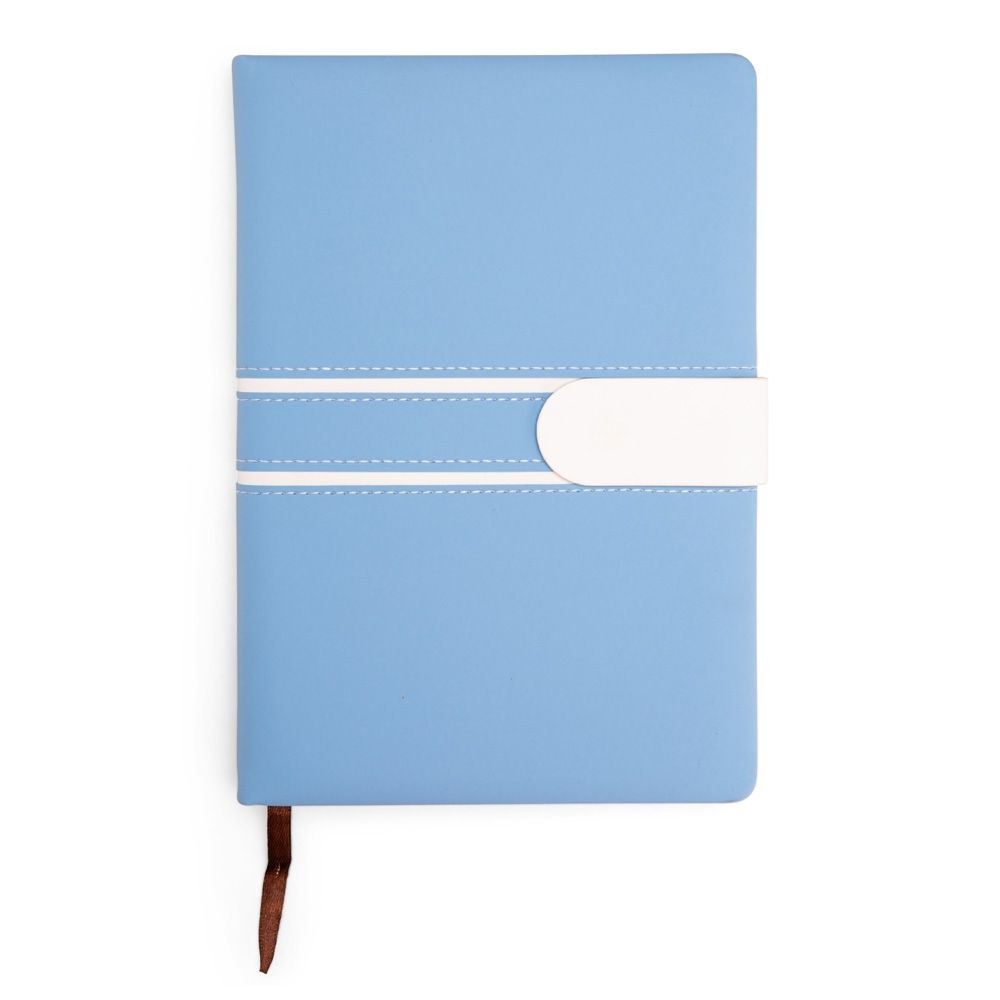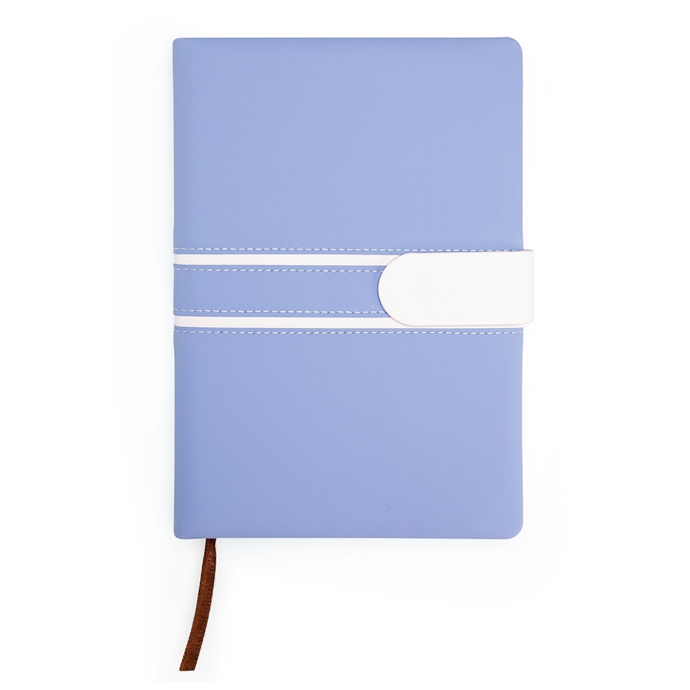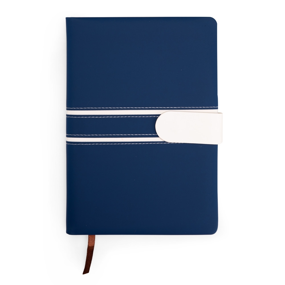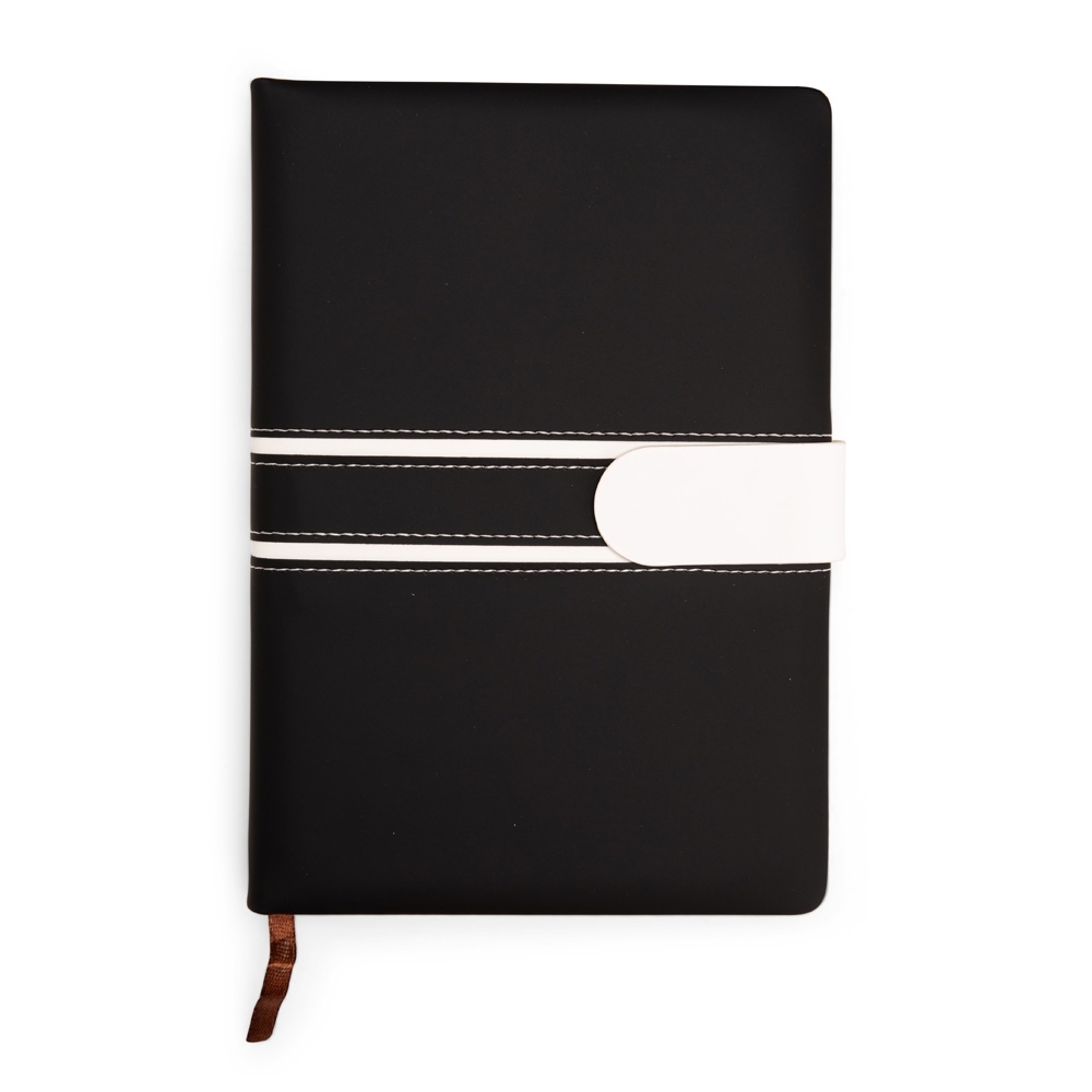Caderneta com capa em couro sintético, fecho magnético e marca-páginas em fita de cetim. Possui aproximadamente 112 folhas marfim com pauta.