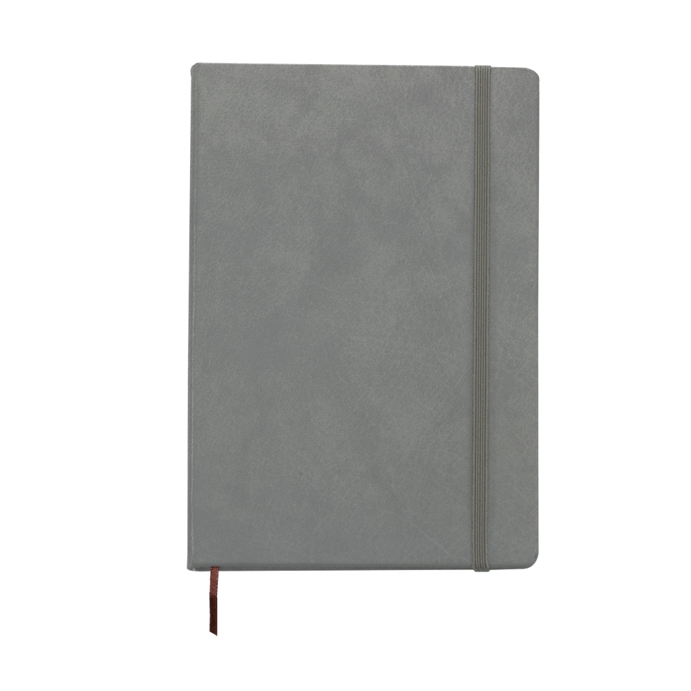 Caderneta de couro sintético, marcador de página em cetim e fita elástica para fechar. Contém aproximadamente 78 folhas amareladas sem pauta.