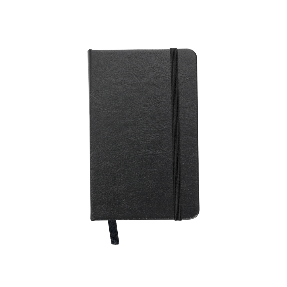 Caderneta de couro sintético com elástico para lacre e marcador de página em cetim, contém 80 folhas sem pauta.