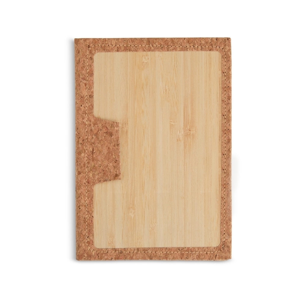 Caderneta de bambu com detalhe em cortiça. Possui aproximadamente 96 folhas brancas pautadas e suporte para caneta.