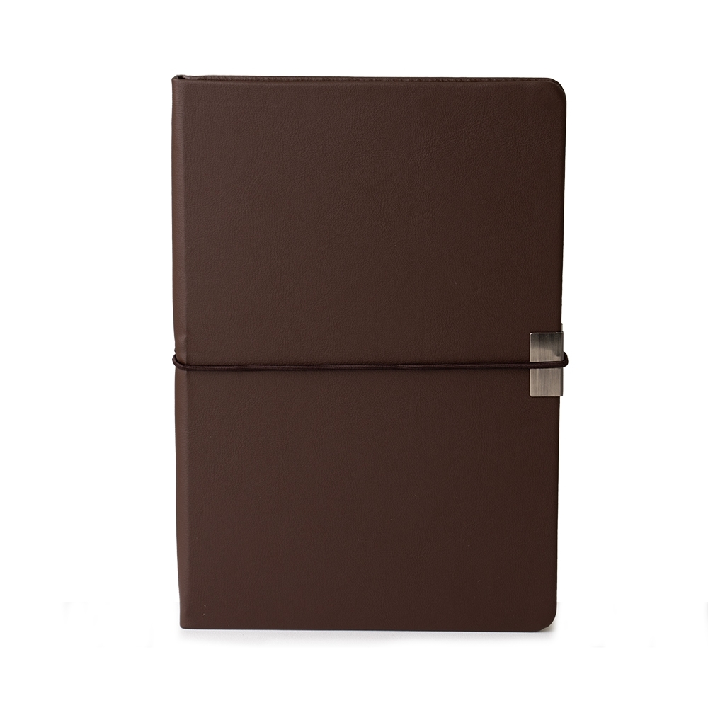 Caderneta em couro sintético com detalhe metálico, marcador de página em cetim e fita elástica para fechar. Contém aproximadamente 96 folhas marfim com pauta.