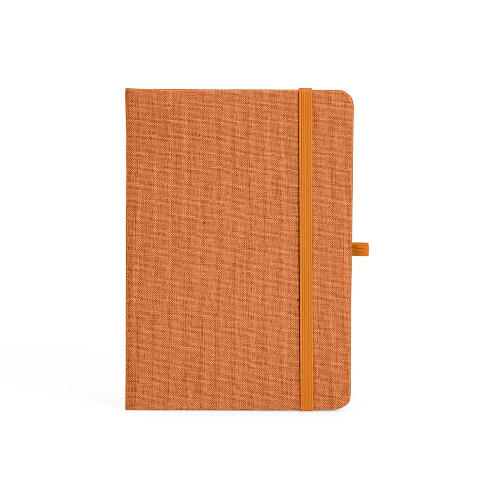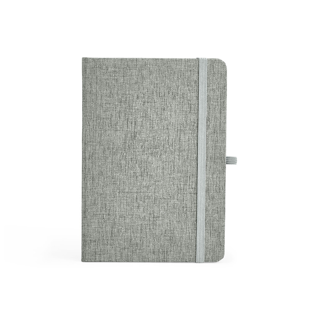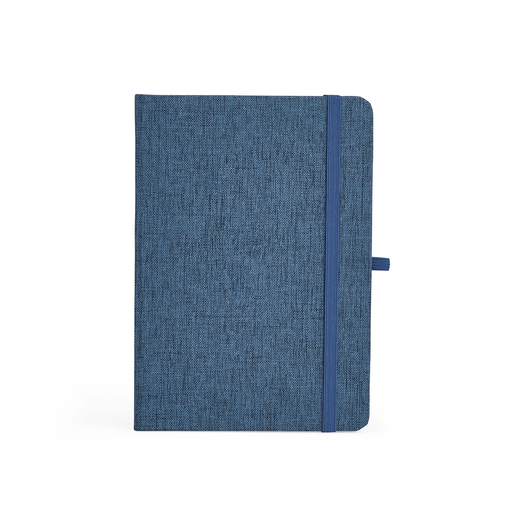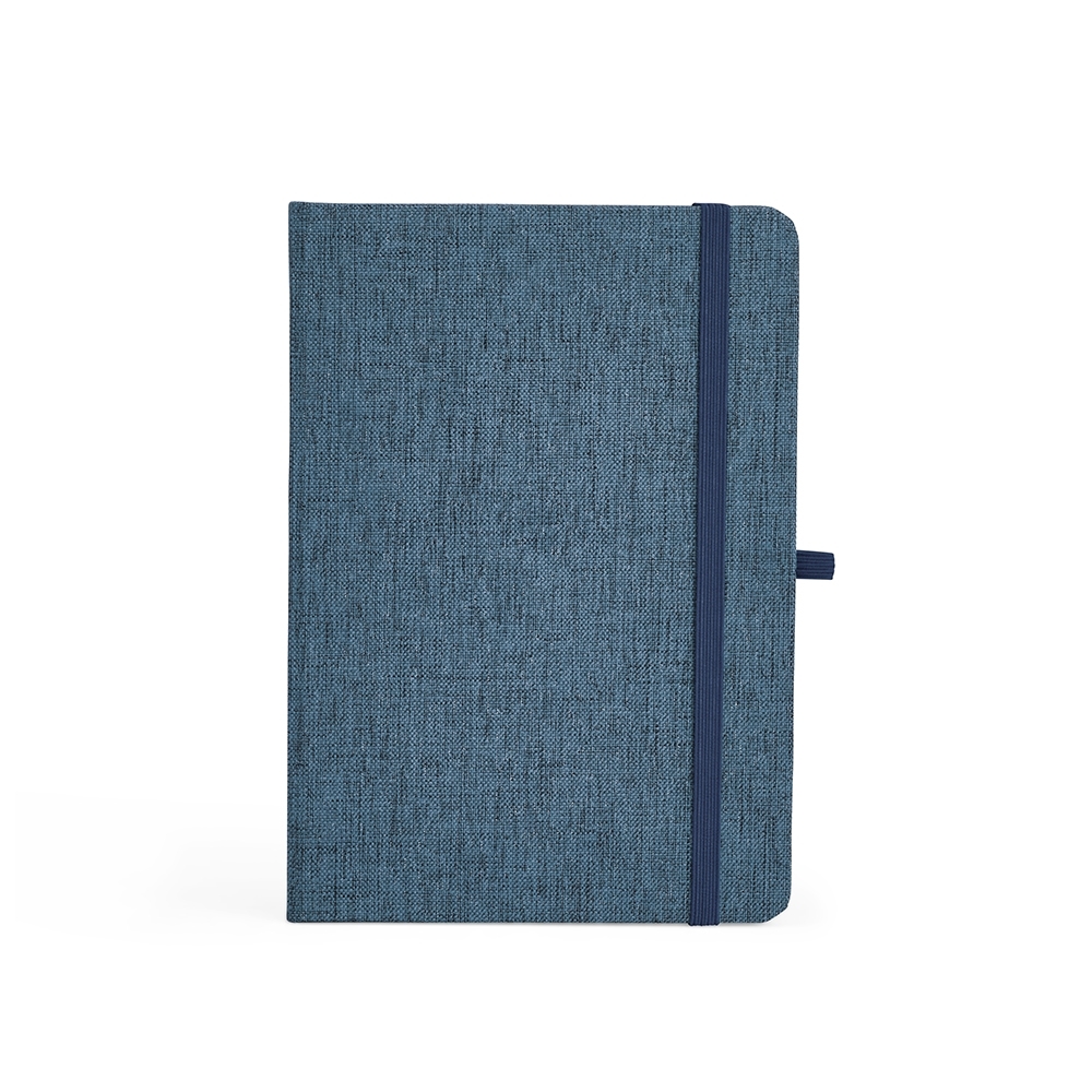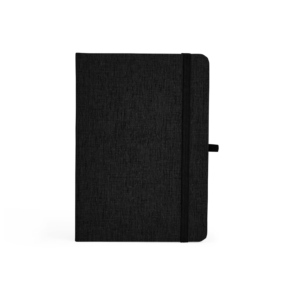 Caderneta feita de linho com porta caneta elástico, marcador de página em cetim e fita elástica para fechar. Contém aproximadamente 80 folhas brancas pautadas.