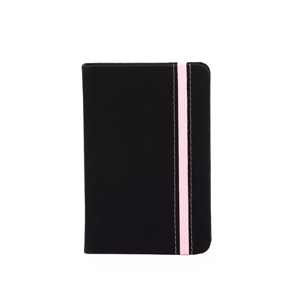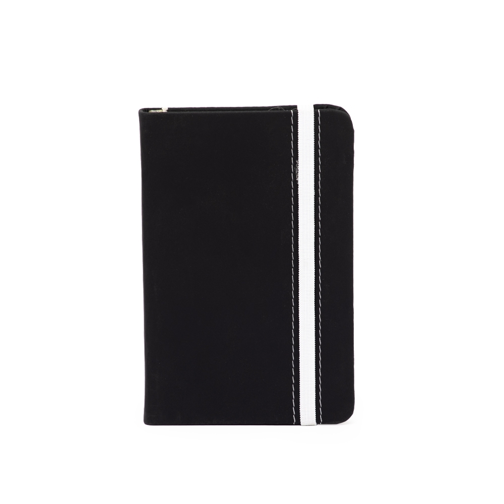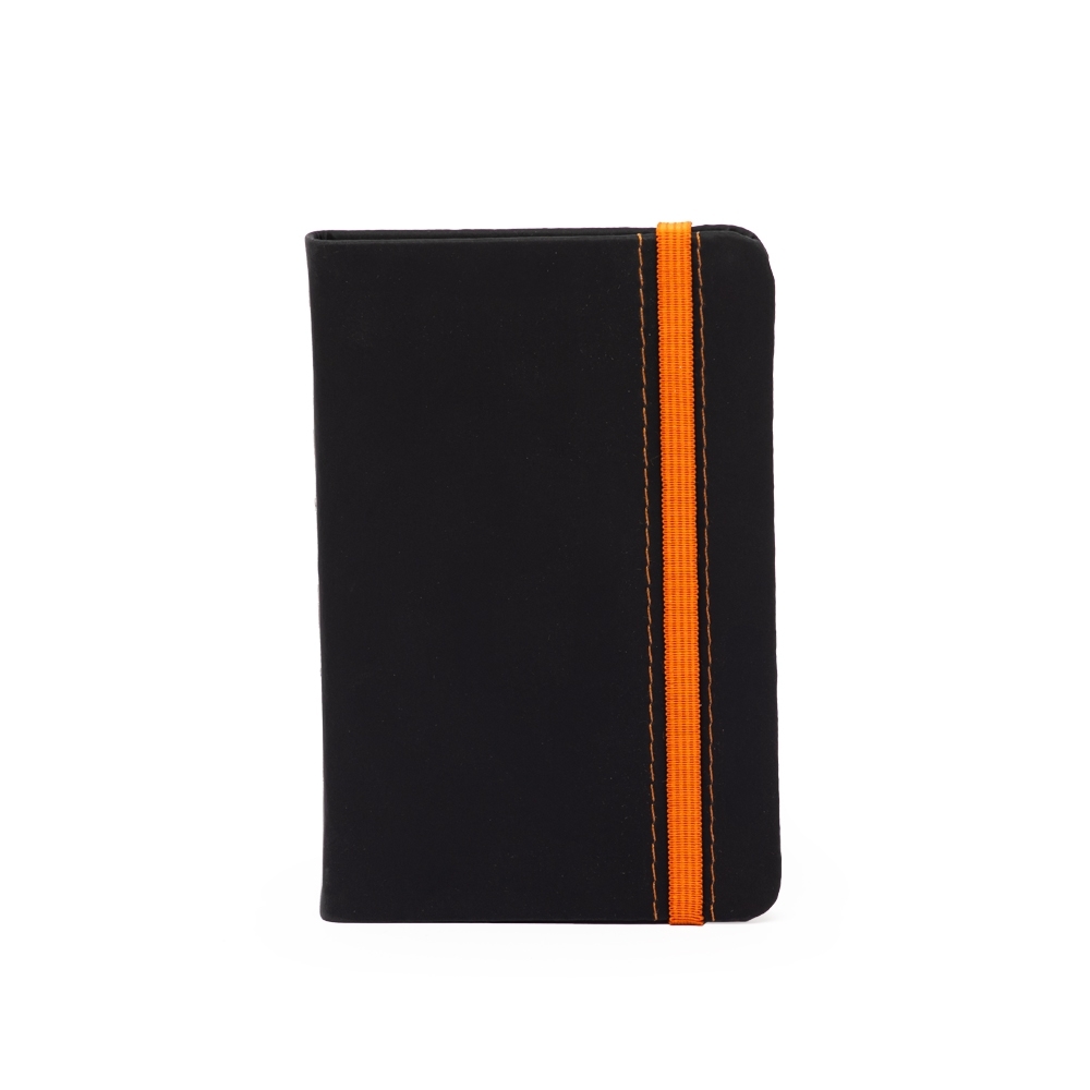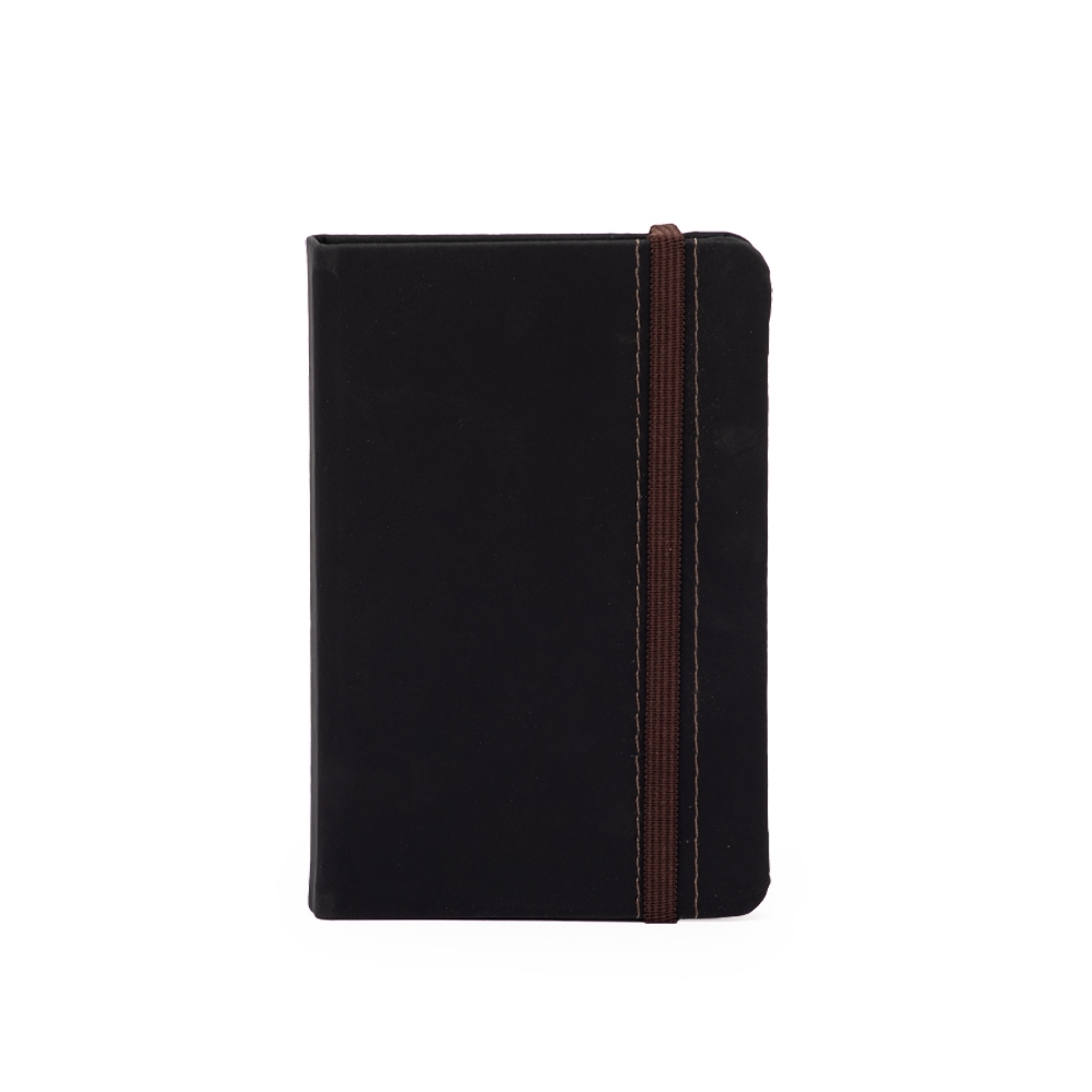 Caderneta emborrachada com marcador de página em cetim e fita elástica de nylon para fechar. Contém aproximadamente 78 folhas marfim sem pautas.