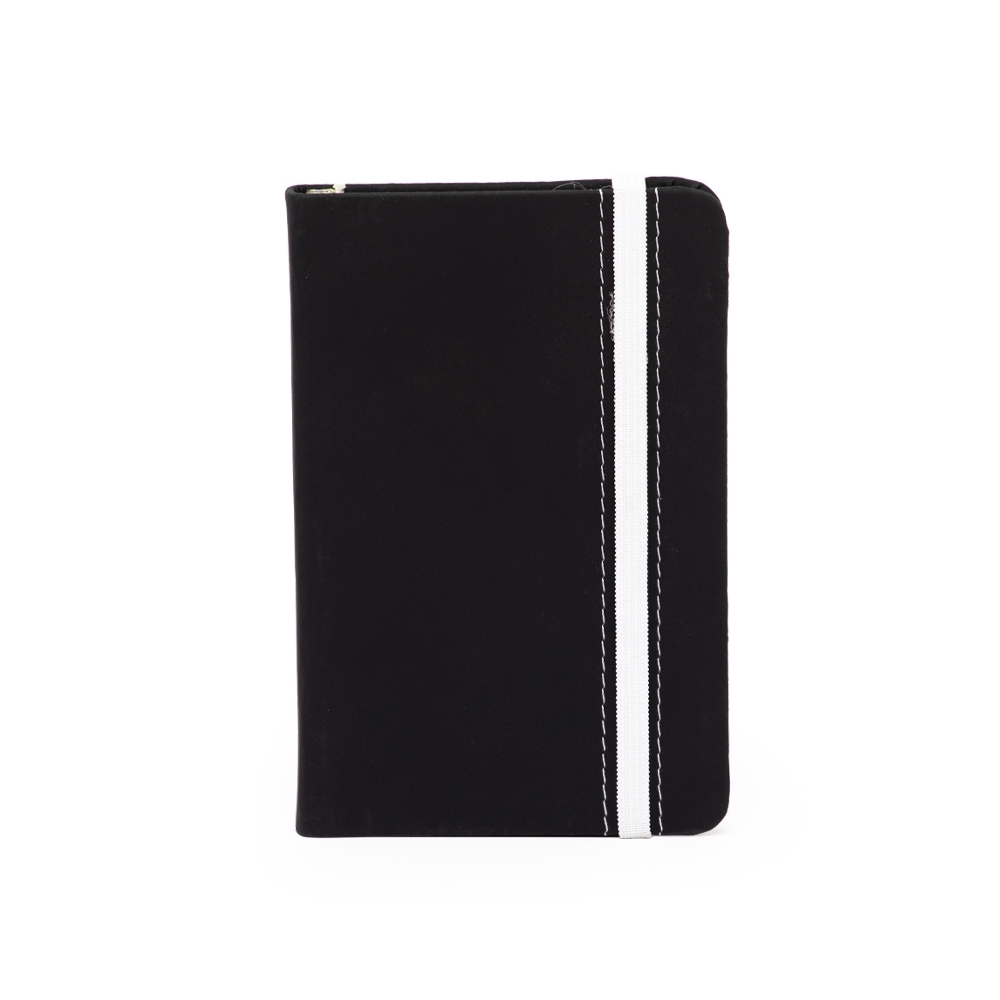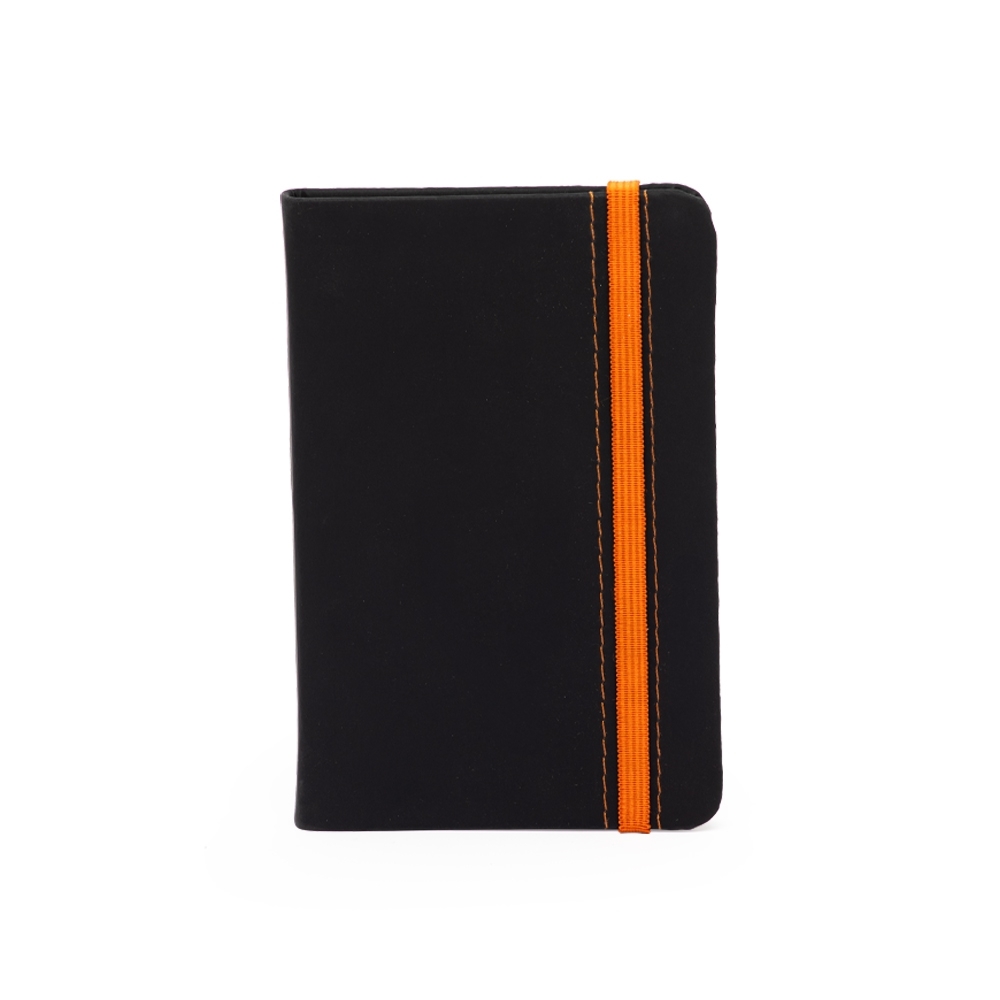 Caderneta emborrachada com marcador de página em cetim e fita elástica de nylon para fechar. Contém aproximadamente 78 folhas marfim pautadas.