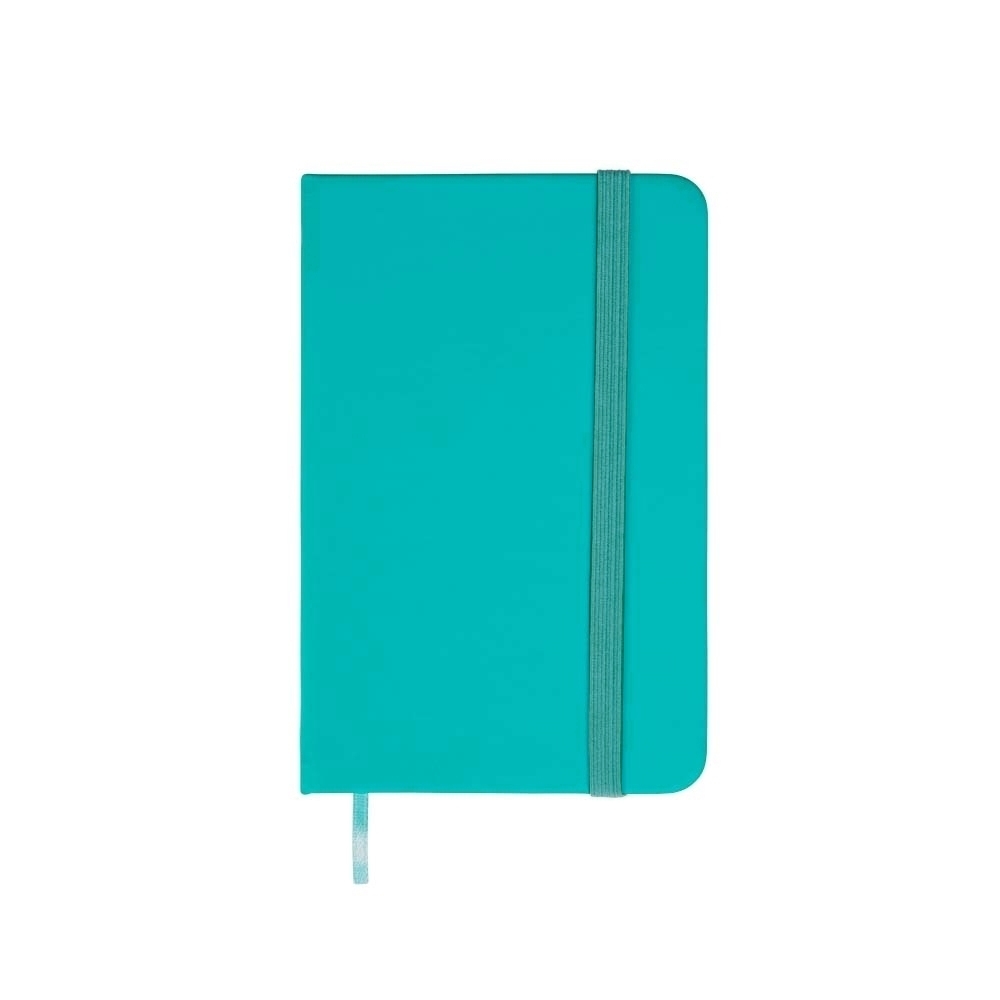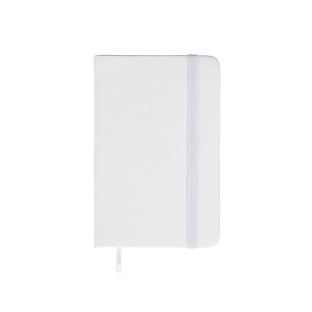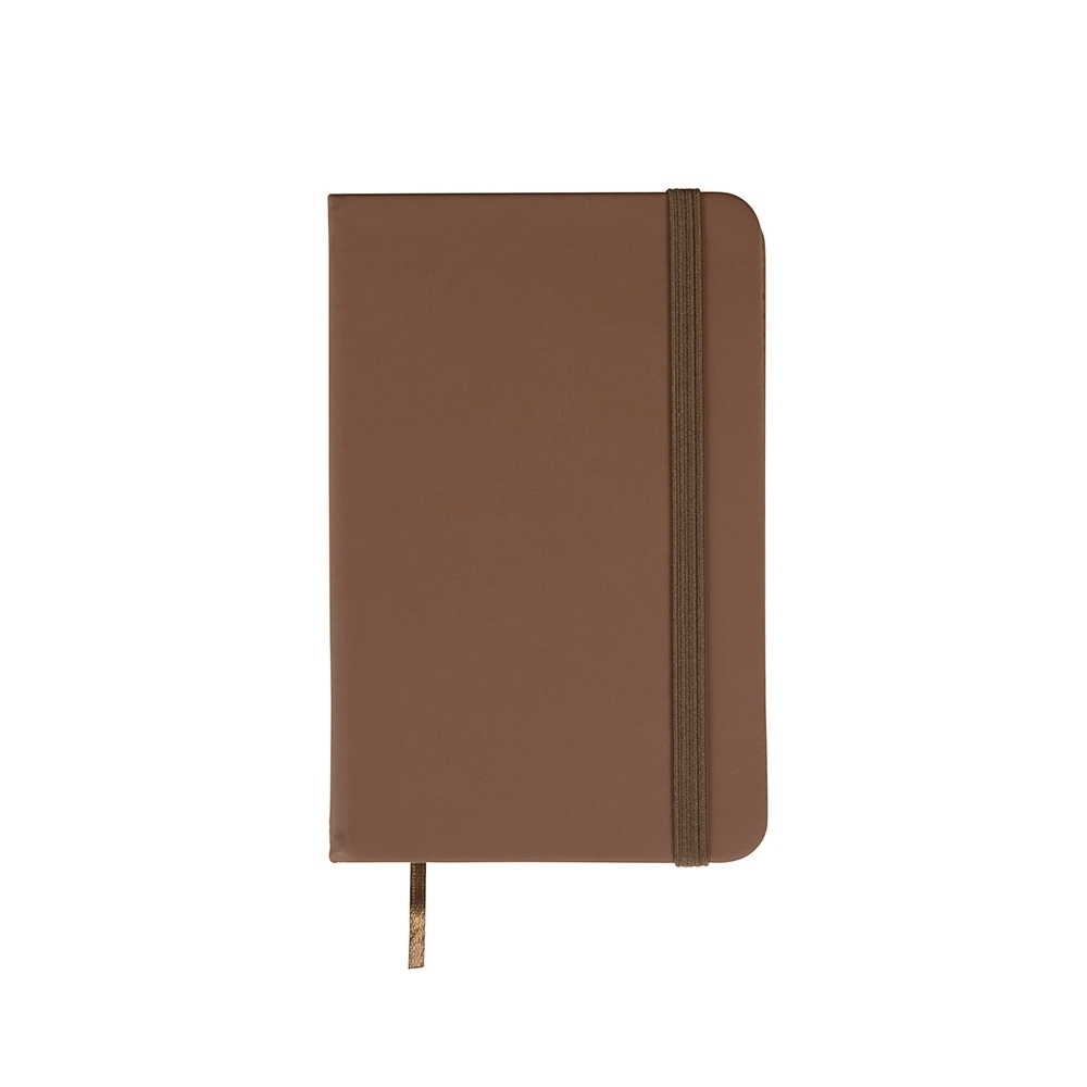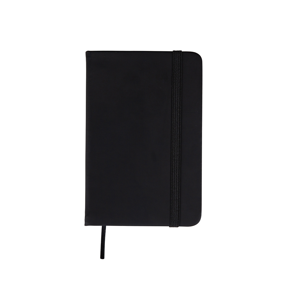 Caderneta com capa emborrachada, marca-páginas em fita de cetim e fechamento em elástico. Possui aproximadamente 80 folhas pardas não pautadas.