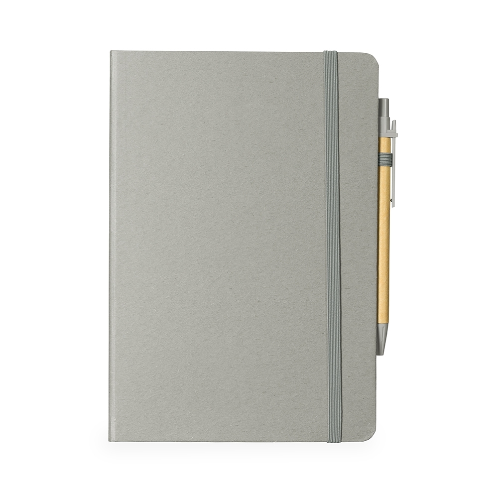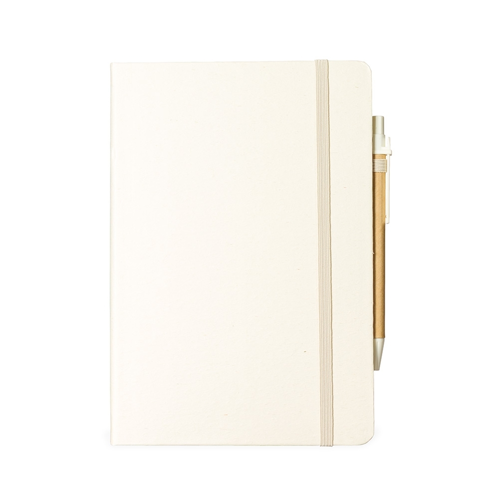 Caderneta ecológica com capa em fibra da palha de arroz. Contém aproximadamente 80 folhas amareladas com pauta, além de duas folhas de guarda, uma fita elástica para fechamento e porta-canetas em elástico. Acompanha uma caneta esferográfica de carga azul de 1,0mm com corpo em papelão e clip, acionamento por clique e ponteira em plástico.