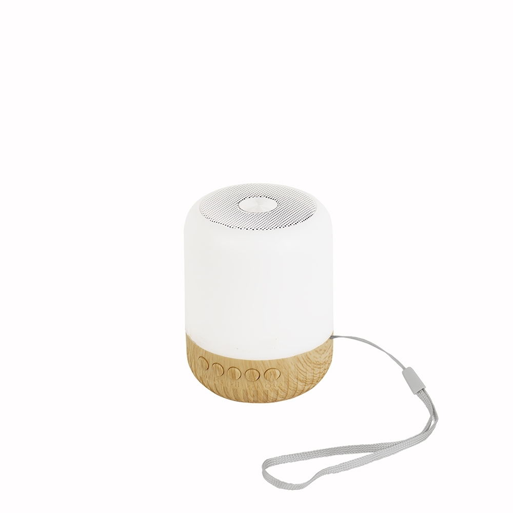 Caixa de som multimídia sem fio em plástico com detalhes que remetem à textura de madeira e um anel antiderrapante colado à base. Conta com iluminação em LED e painel de botões para alternância entre os modos Bluetooth, rádio FM e reprodução de arquivos MP3 a partir das entradas para cartão TF (microSD) e USB para pen drives. Acompanha cabo Tipo-C para carregamento.