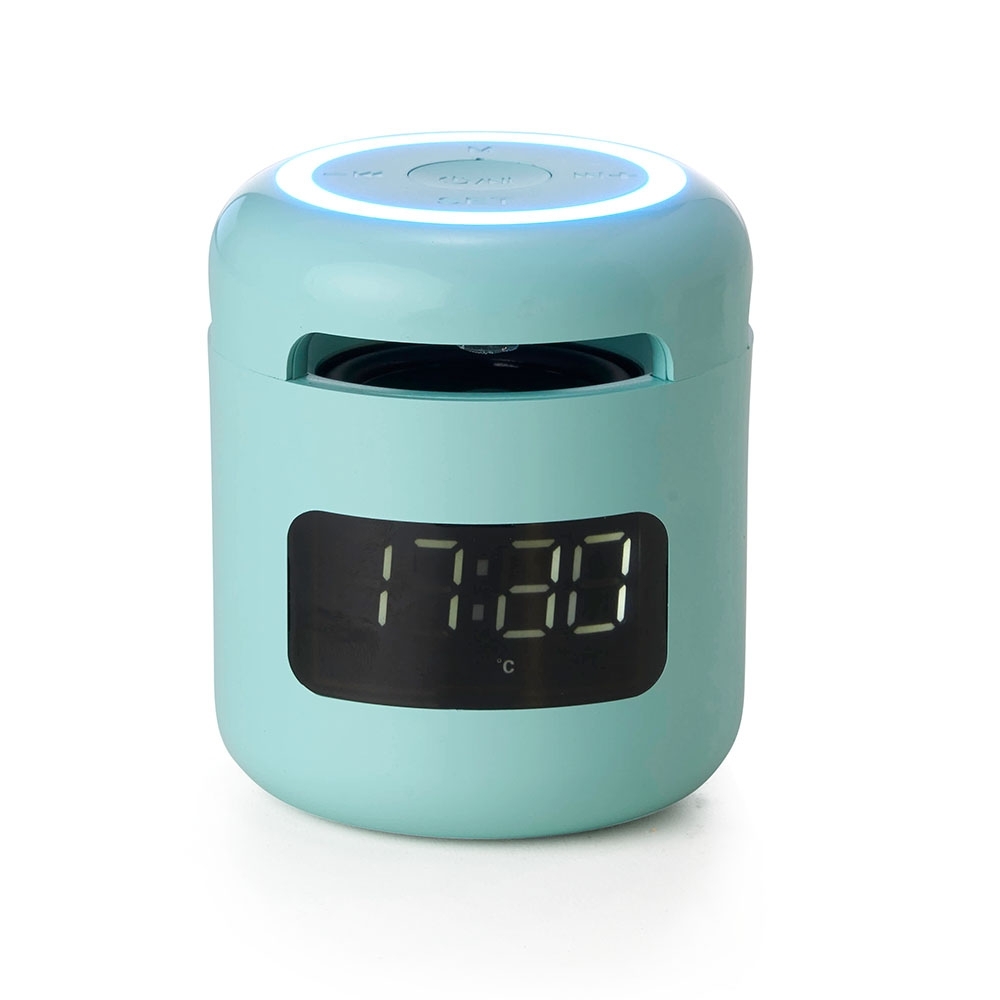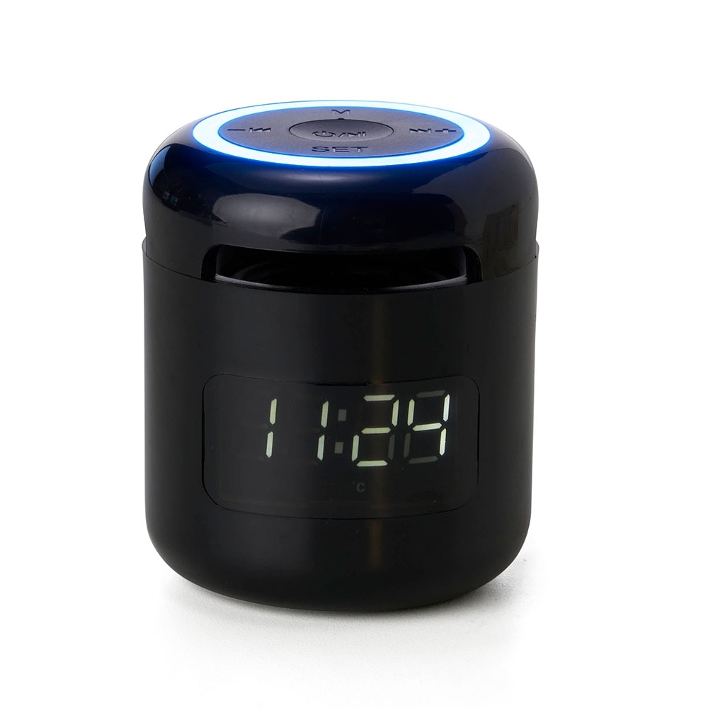 Caixa de som multimidia com estrutura em plástico, display frontal em LED e base emborrachada antiderrapante. Possui conexão Bluetooth 5.0 e entradas para cabo auxiliar P2 e cartão TF (microSD), que permitem a reprodução de arquivos MP3, além de função para sintonia de rádio FM e programação de até três alarmes diferentes. Acompanha cabo USB-C.