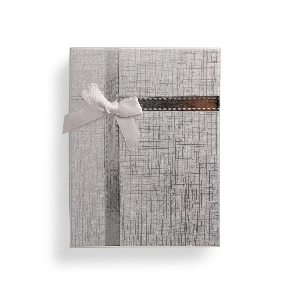 Caixa para presente em papelão com acabamento levemente texturizado e laço decorativo de cetim colado na tampa. Conta ainda com berço removível em espuma com ranhuras.