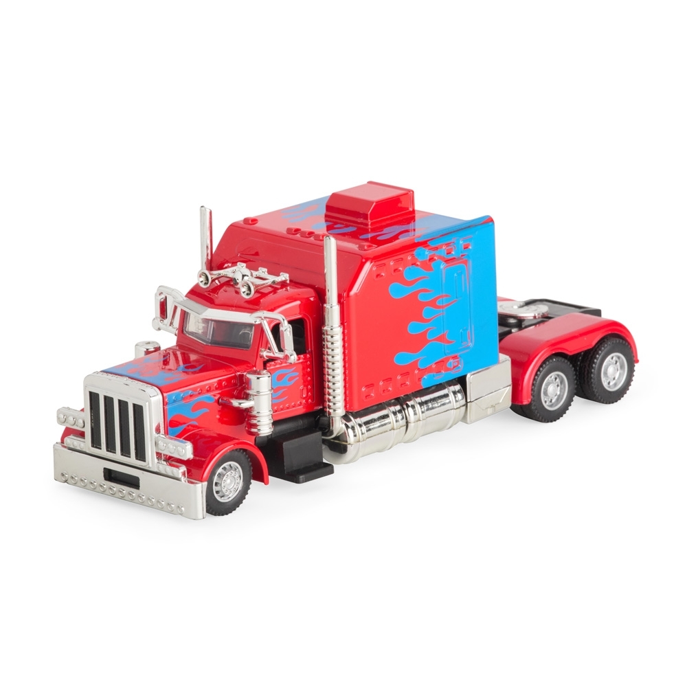 Caminhão em miniatura feito em plástico e metal. Apresenta mecanismo de fricção nas rodas traseiras, portas com fechamento funcional e acabamento detalhado.