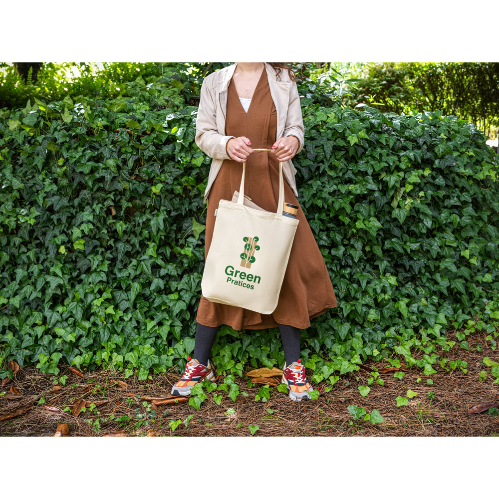 Sacola em 100% algodão reciclado (220 g/m²) com alças de 65 cm. 380 x 420 x 100 mm