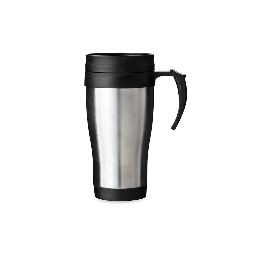 Caneca em inox com capacidade máxima de 400ml. Conta com alça, interior e tampa rosqueável com trava de segurança em plástico. Observação: apresenta marcas visíveis na parte externa.