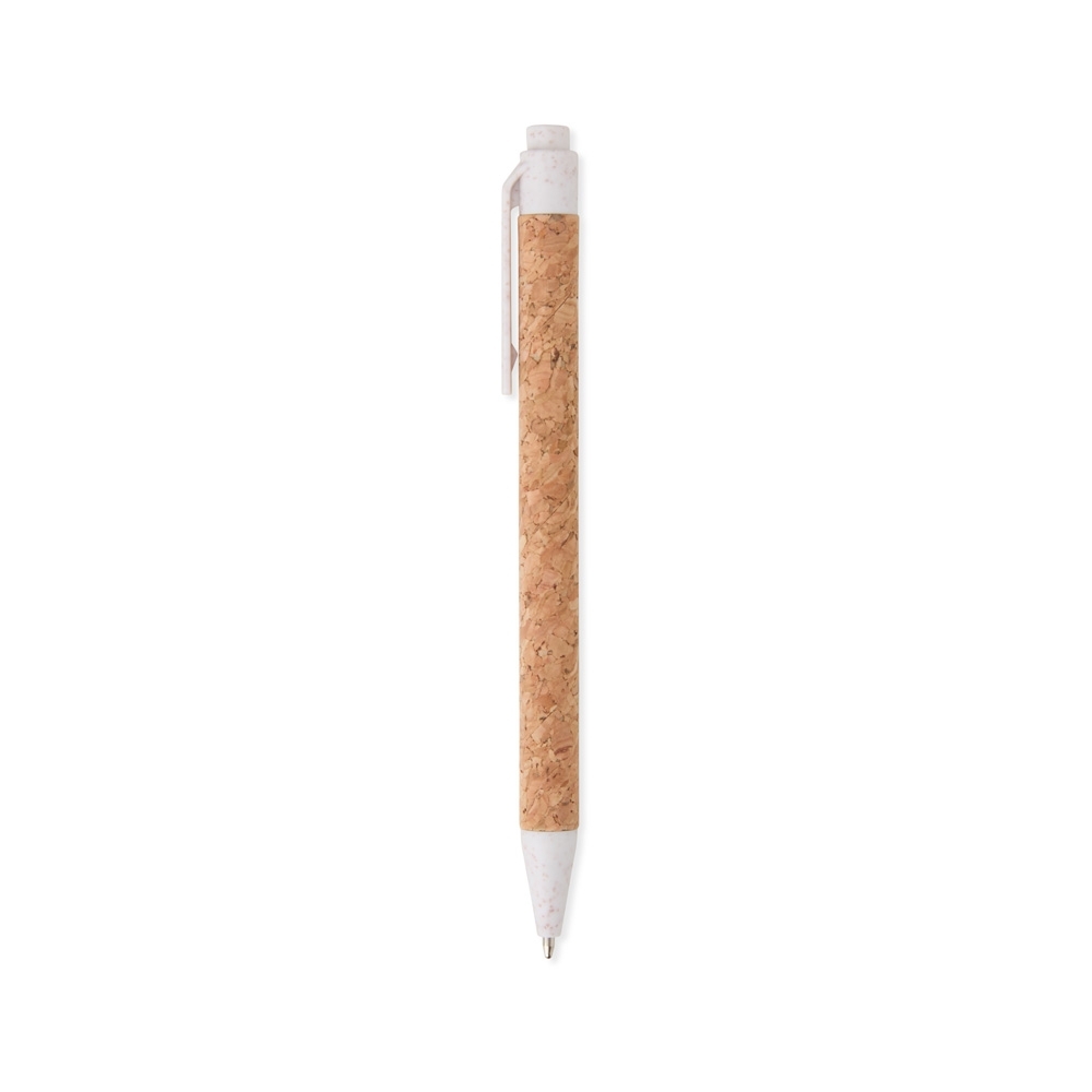 Caneta de cortiça com detalhes em palha de trigo, carga esferográfica azul 1.0mm e acionamento por clique. OBS.: PEDIDOS MÍNIMO DE 50 PEÇAS!