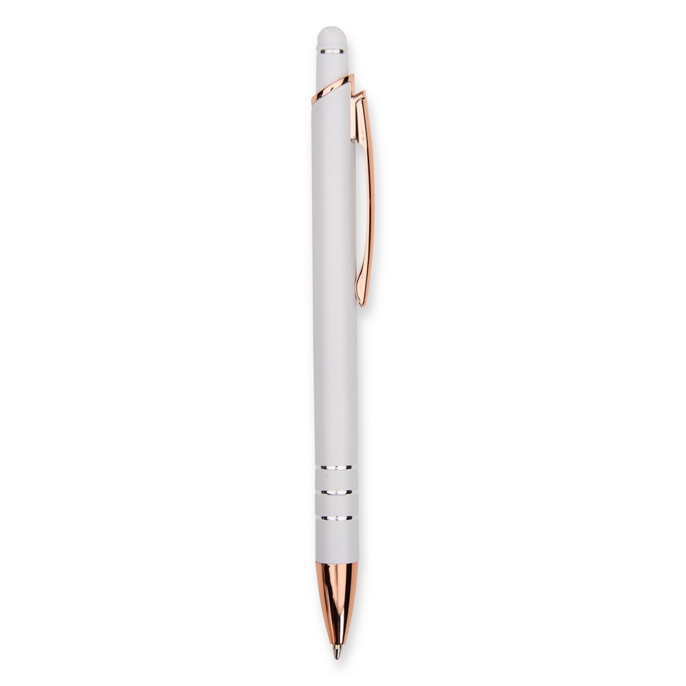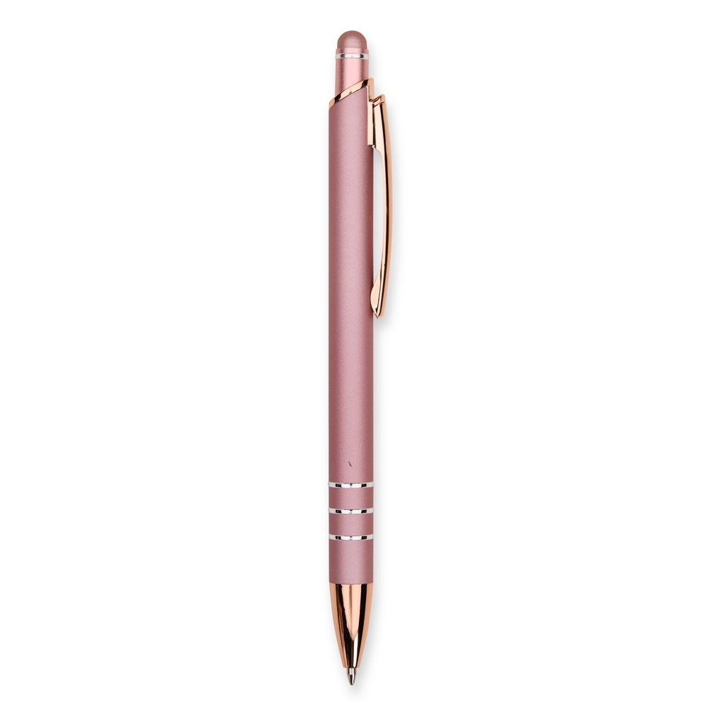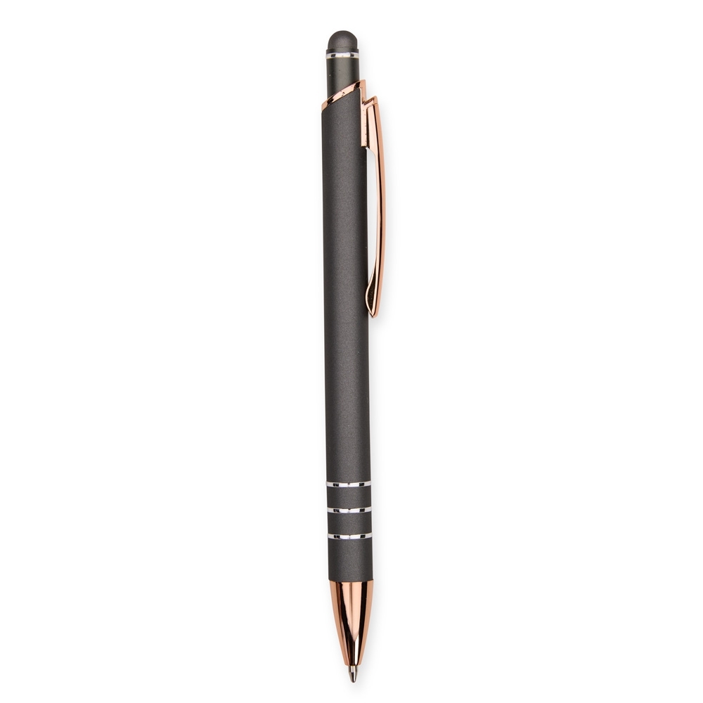 Caneta metálica com carga esferográfica azul de 1,0mm e acionamento por clique com acabamento emborrachado para interação em dispositivos com tela sensível ao toque.