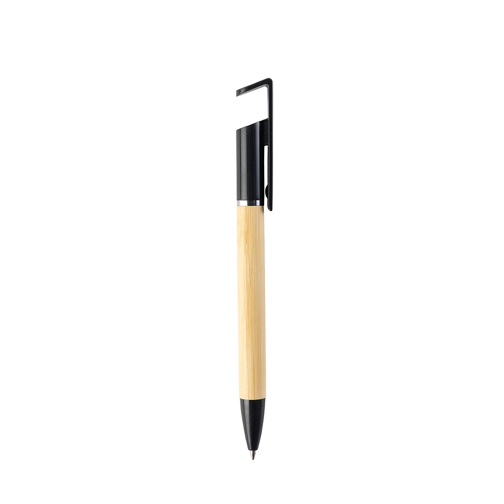 Caneta em bambu com ponta e ponteira com suporte para celular em plástico, acionamento por rotação e carga esferográfica azul de 1.0mm.
