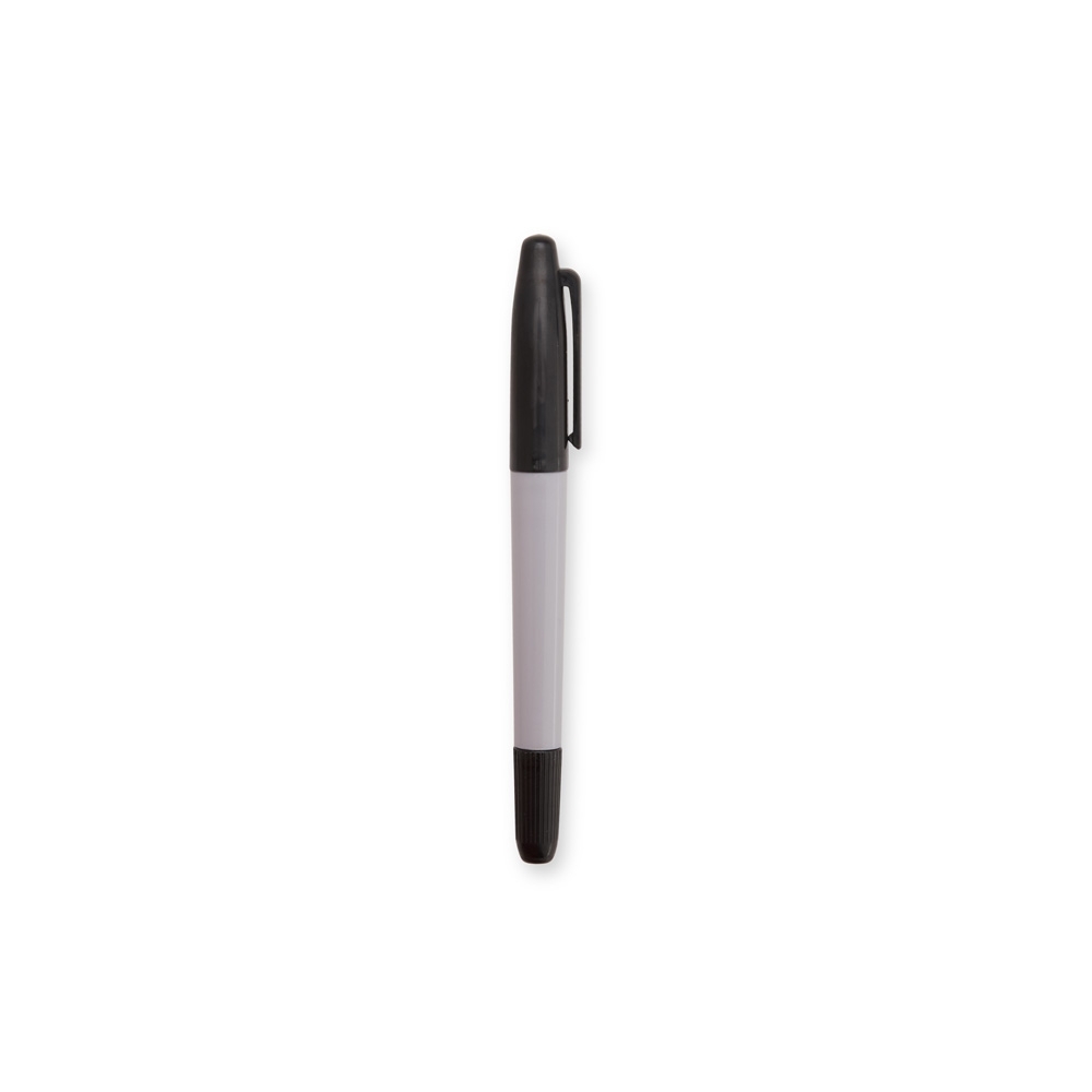Caneta marcadora plástica com duas pontas em formatos diferentes: uma fina e outra tipo pincel. Possui tinta atóxica à base de óleo com solvente alcoólico.
