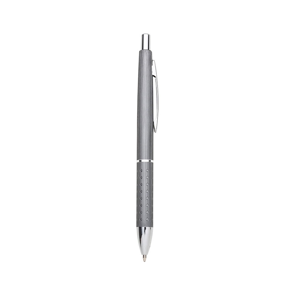 Caneta metálica com pintura escovada colorida, possui anel inferior prata e detalhes em relevo semelhante a strass. Acionamento por clique.