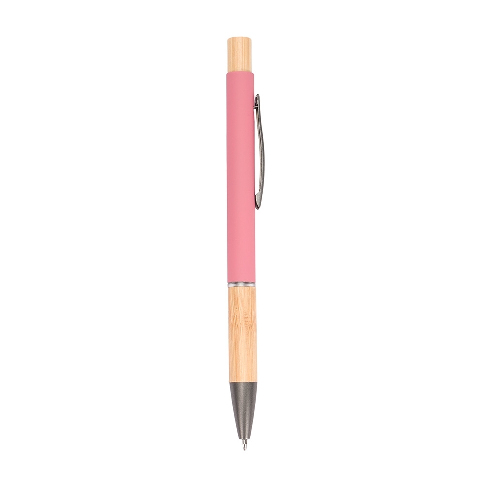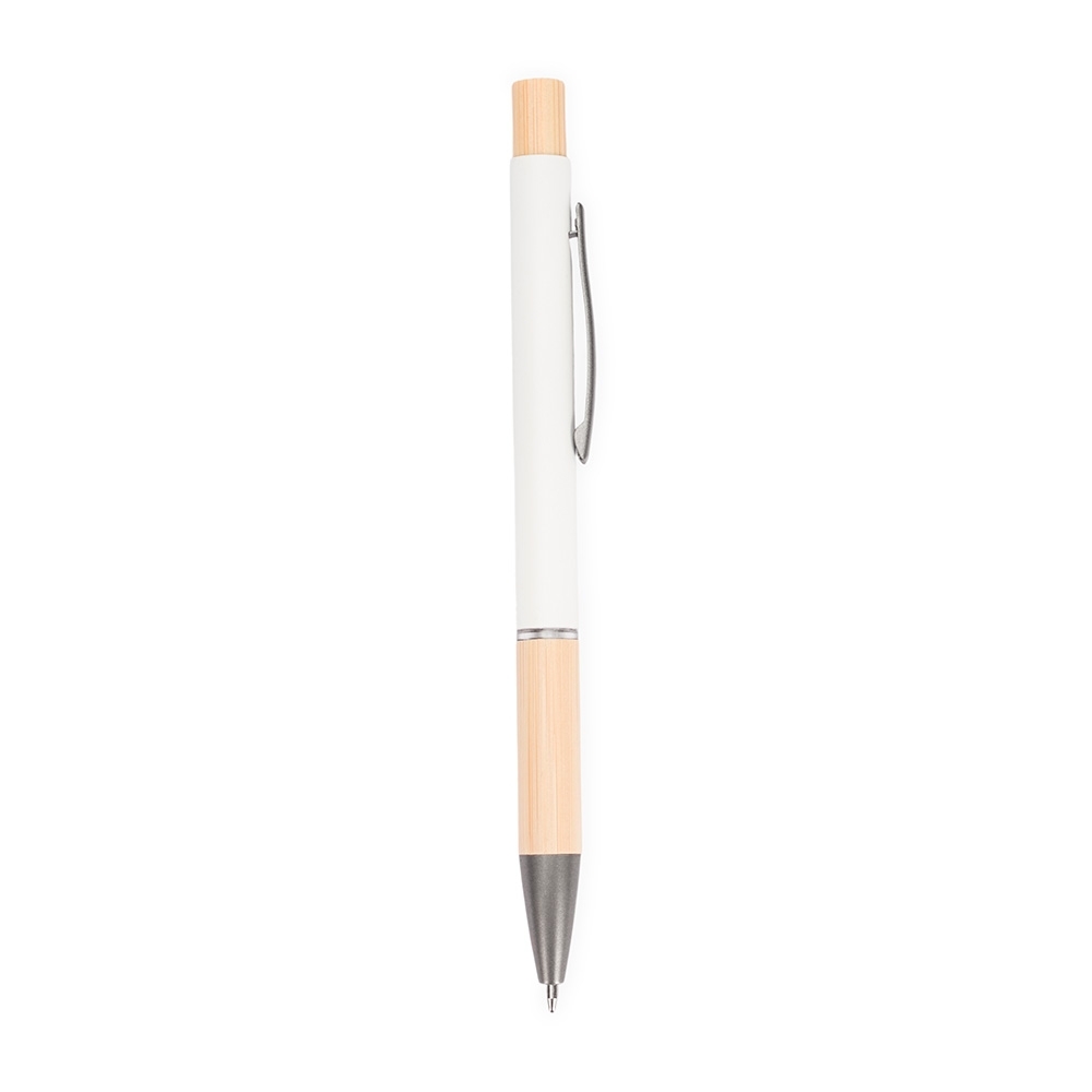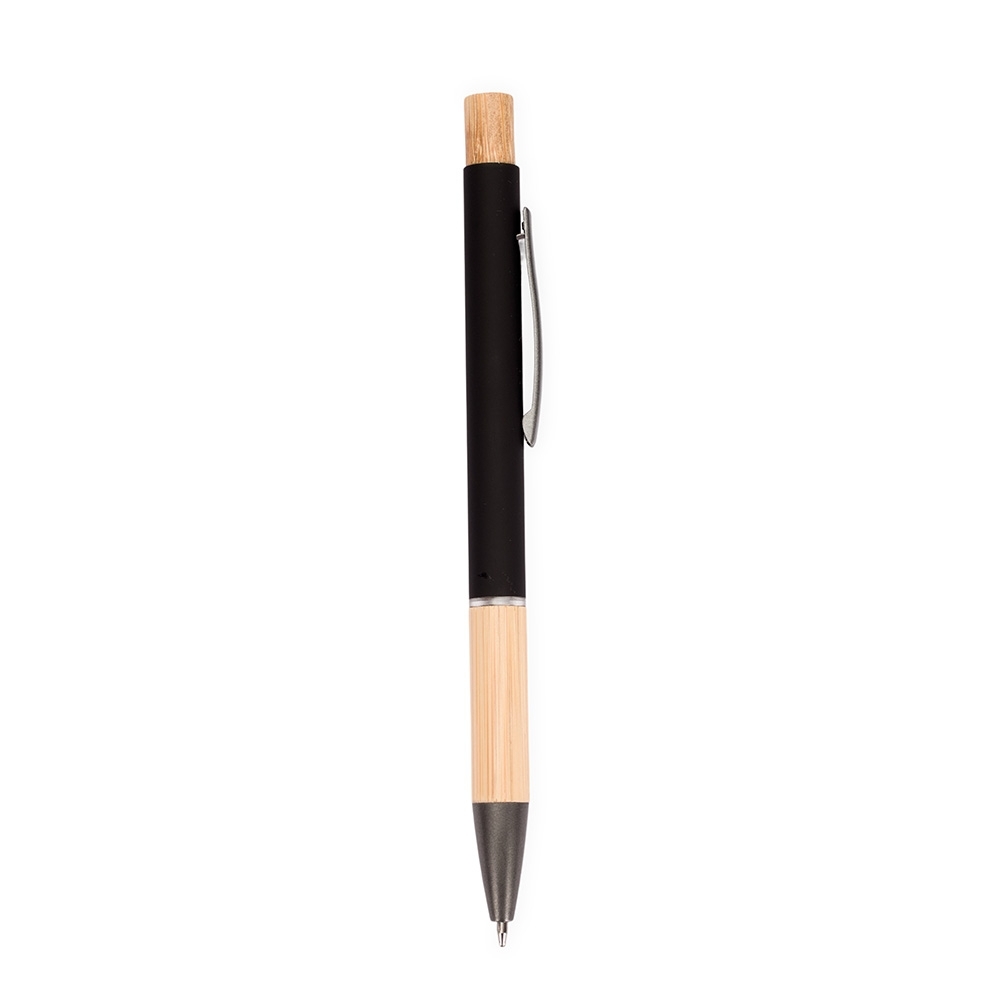 Caneta com carga esferográfica azul de 1.0mm. Apresenta corpo metálico, detalhes em bambu e acionamento por clique, oferecendo uma pegada leve para uma escrita precisa.
