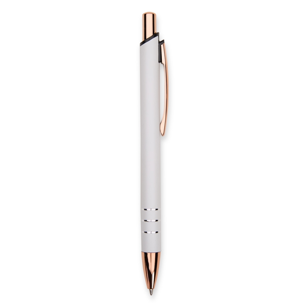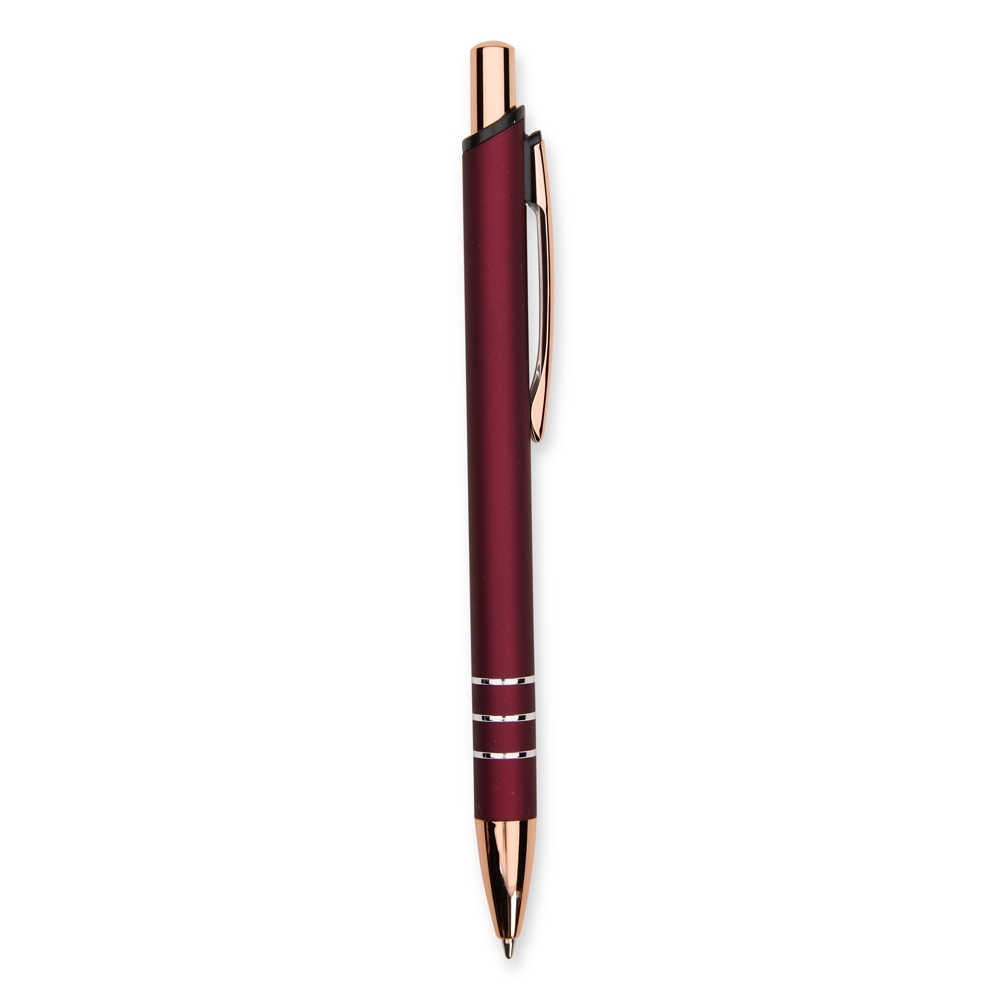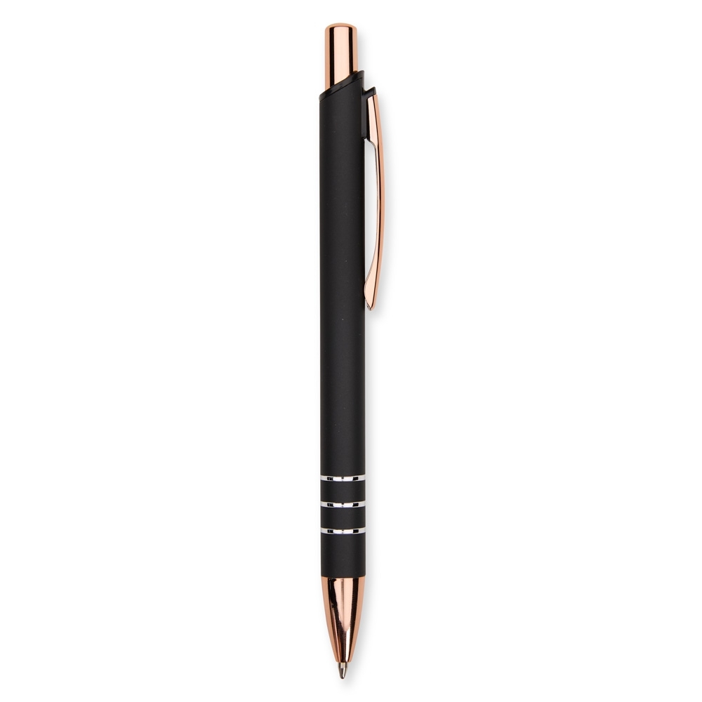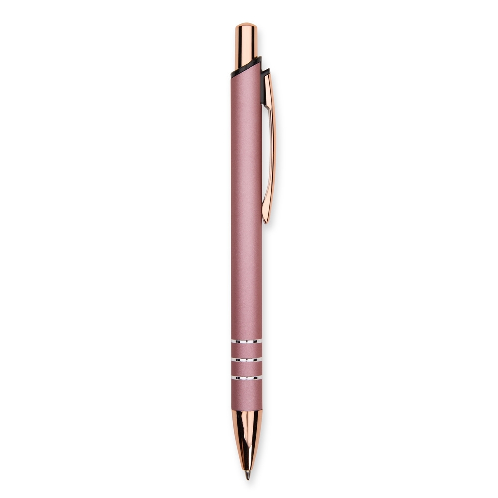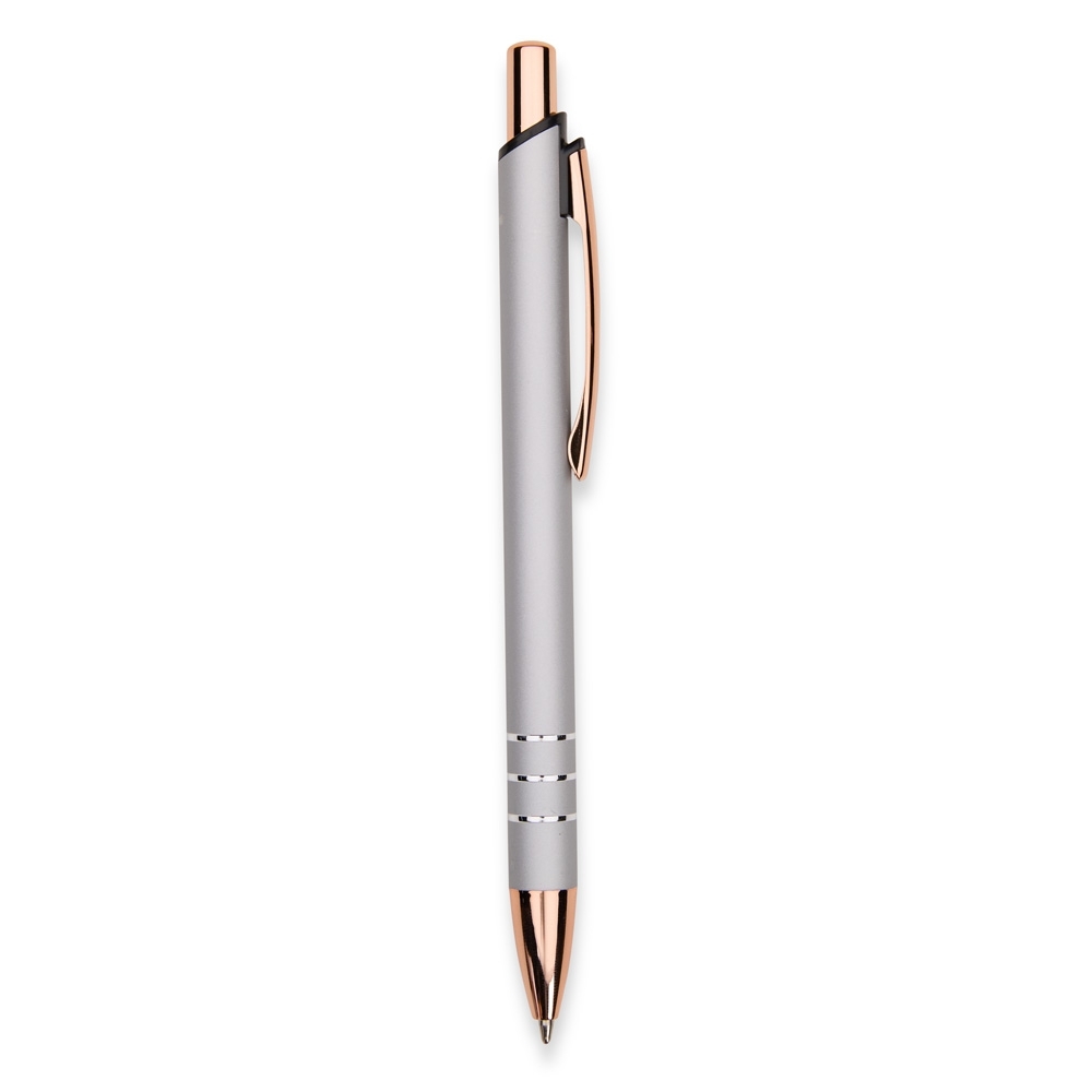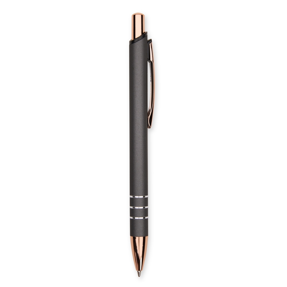 Caneta metálica com acionamento por clique e carga esferográfica azul de 1,0mm, oferecendo uma pegada leve para uma escrita mais precisa.