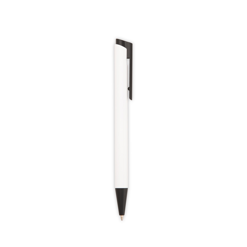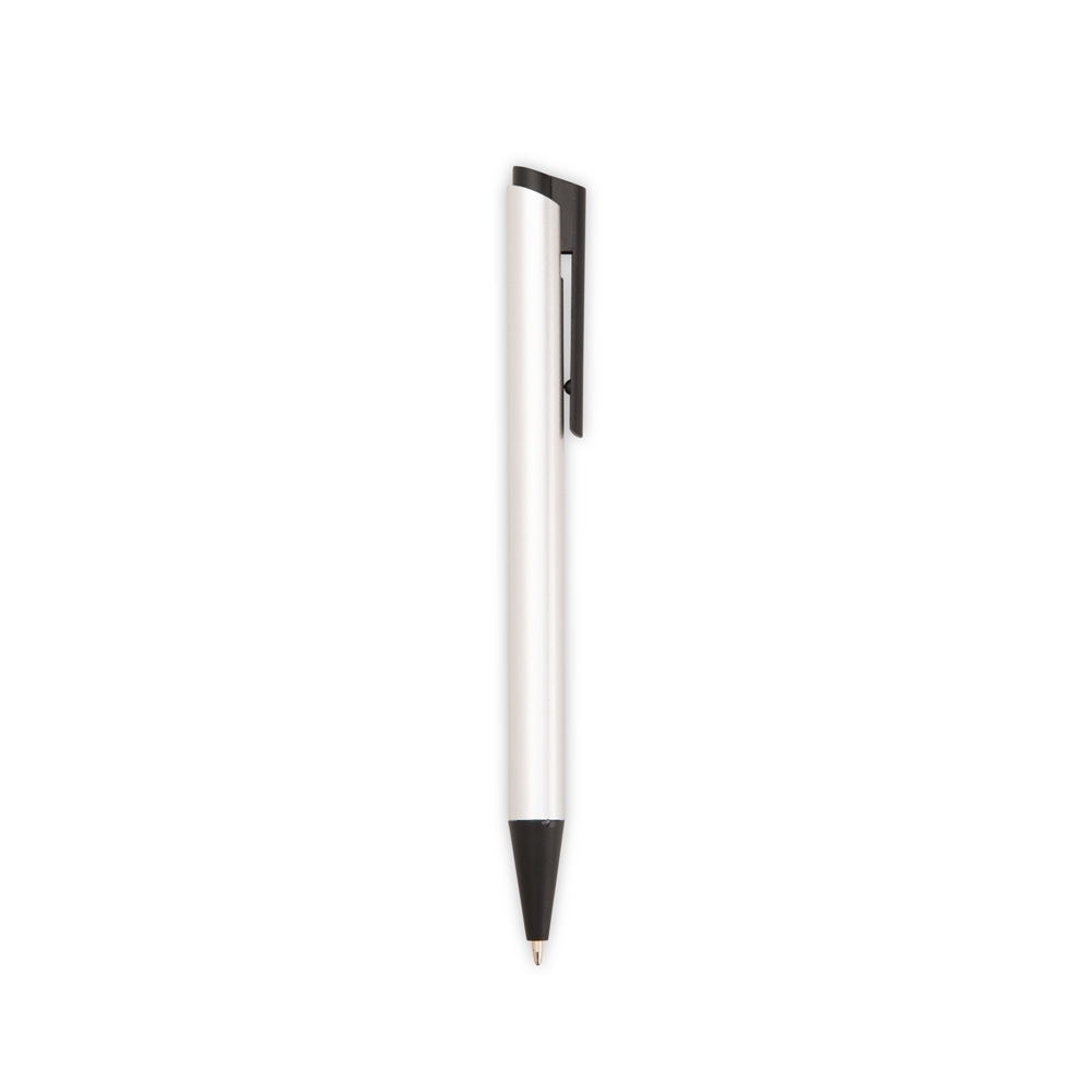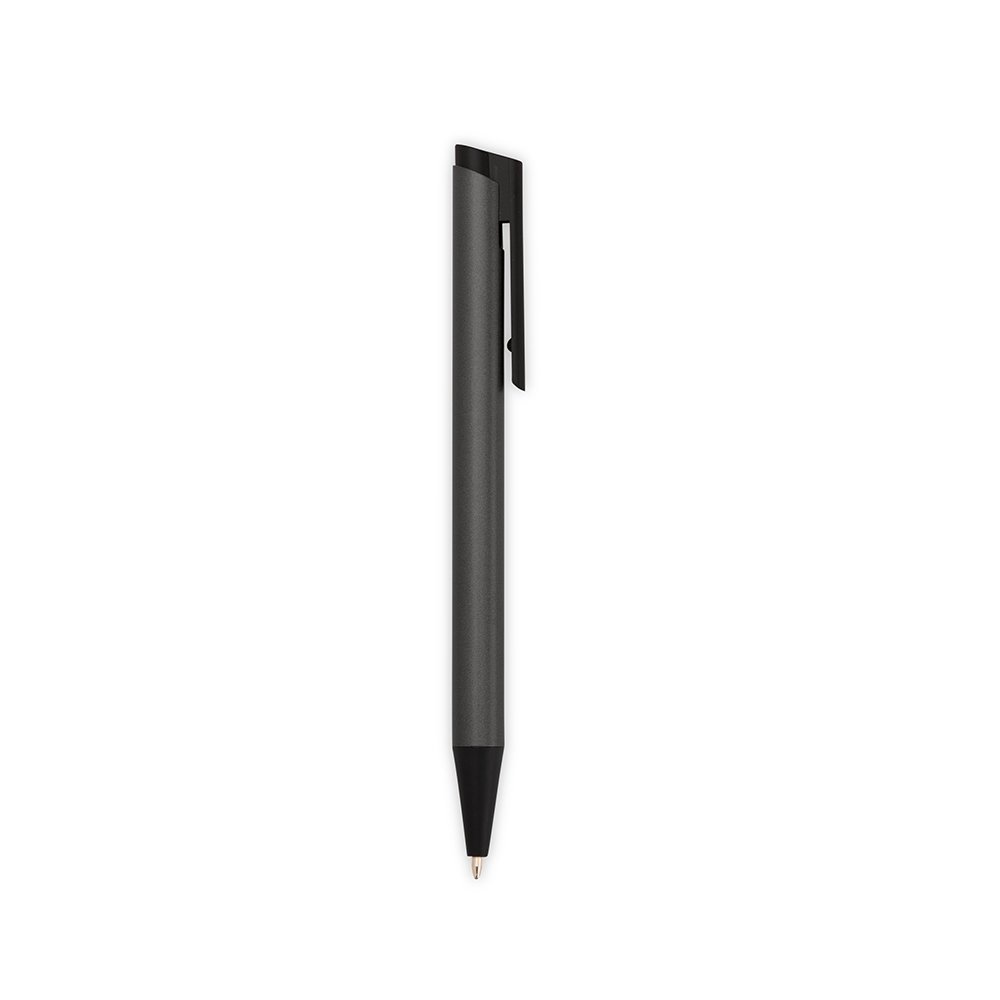 Caneta metálica com ponteira, clip e acionamento em plástico. Possui carga esferográfica azul de 1,0mm e acionamento por clique.