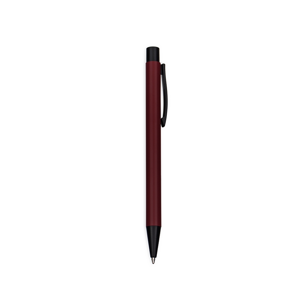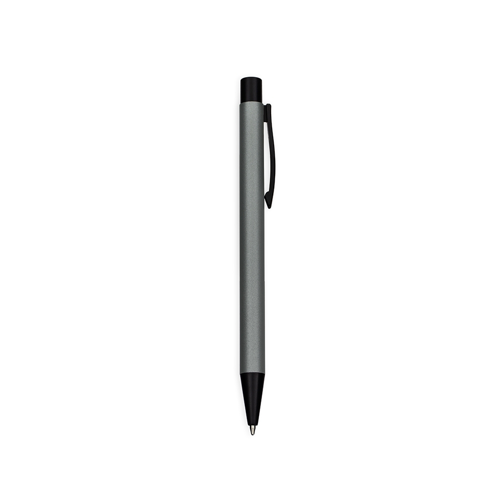 Caneta metálica com acionamento por clique e clip feitos em plástico. Conta ainda com carga esferográfica azul de 1,0 mm.