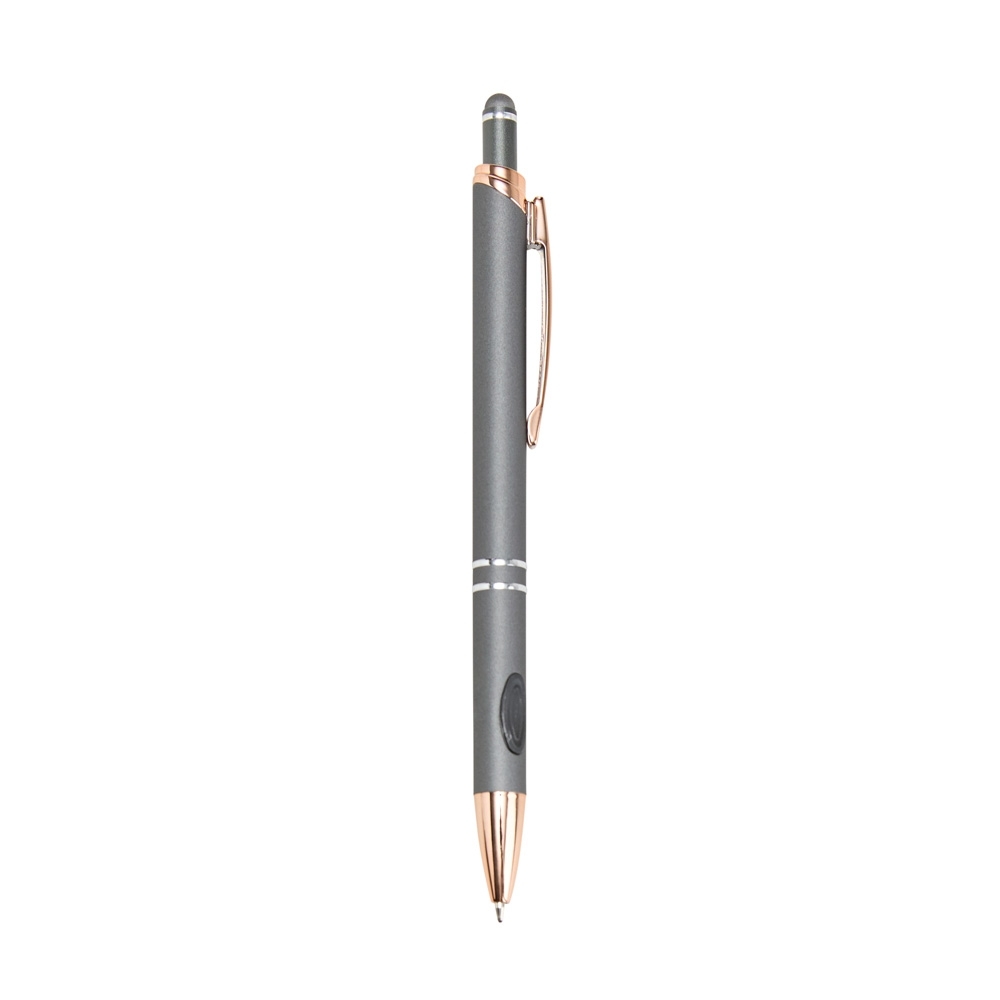Caneta metálica com detalhes em plástico. Possui acionamento por clique com acabamento emborrachado para interação em dispositivos com tela sensível ao toque e carga esferográfica azul de 1,0mm.
