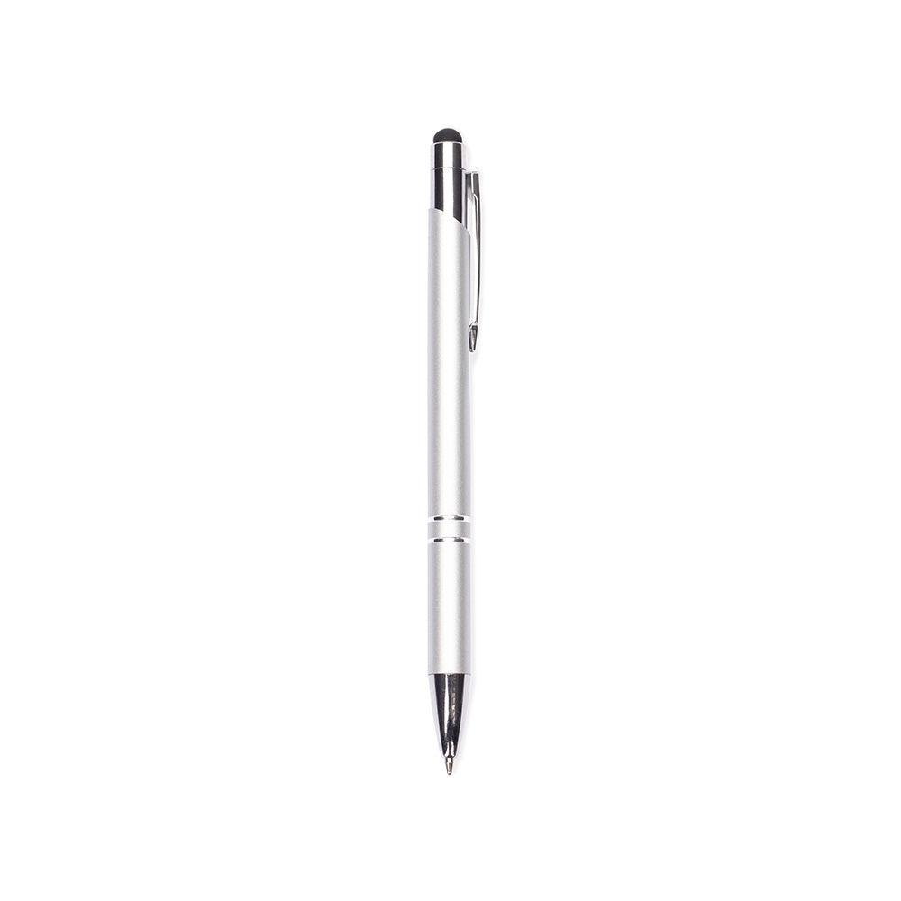Caneta esferográfica de carga azul de 1,0mm. Possui construção inteira em metal e acionamento por clique que proporciona um toque leve para escrita. Além disso, sua ponteira emborrachada permite o uso como uma caneta touch para interação com dispositivos com telas touchscreen.