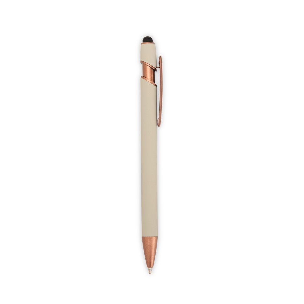 Caneta metálica com pintura de acabamento emborrachado e acionamento por clique. Conta com topo emborrachado para uso em dispositivos com telas sensíveis ao toque, além de carga esferográfica azul de 1,0 mm.