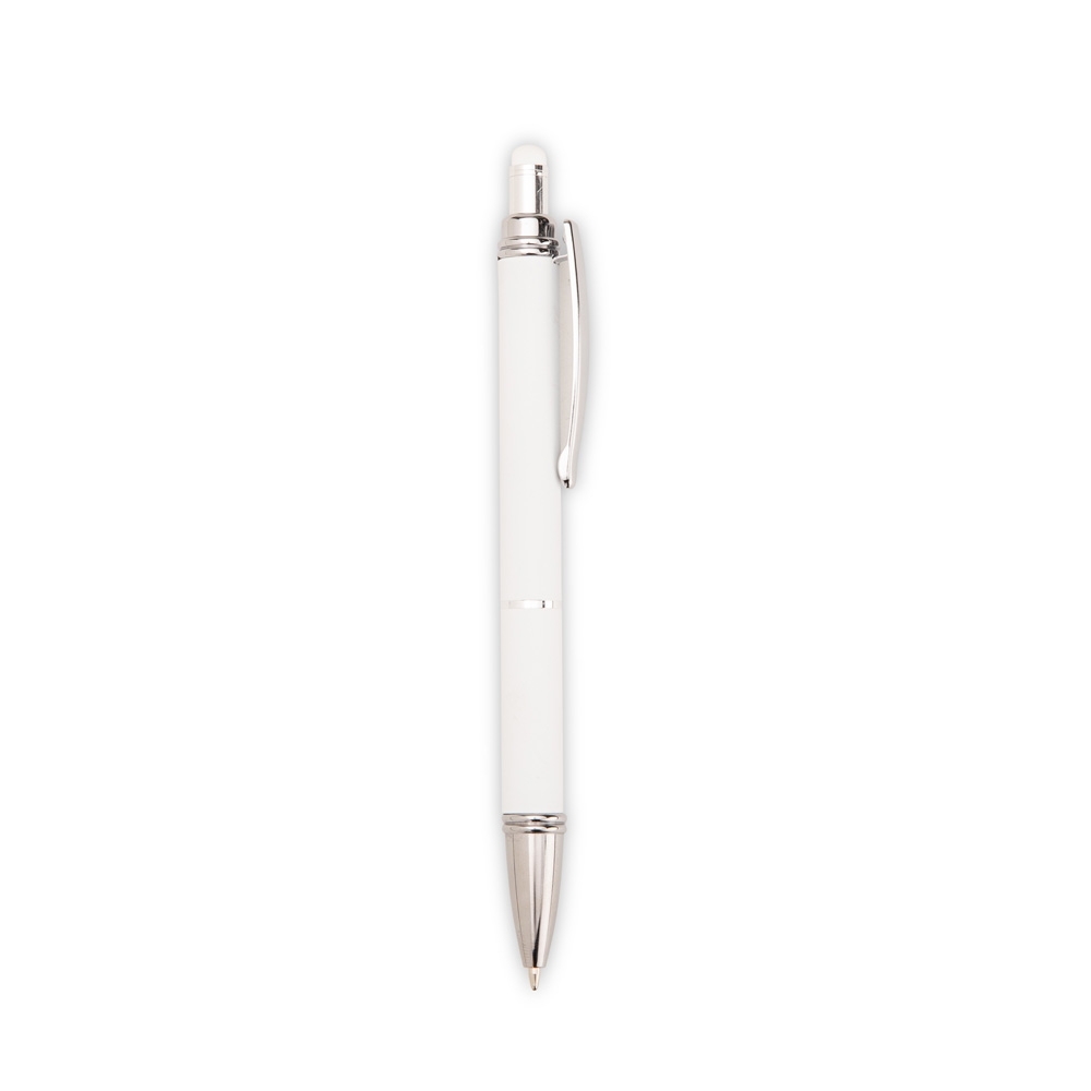 Caneta metálica com pintura de acabamento emborrachado. Possui acionamento por clique, topo emborrachado para uso em dispositivos com telas sensíveis ao toque e carga esferográfica azul de 1,0 mm.