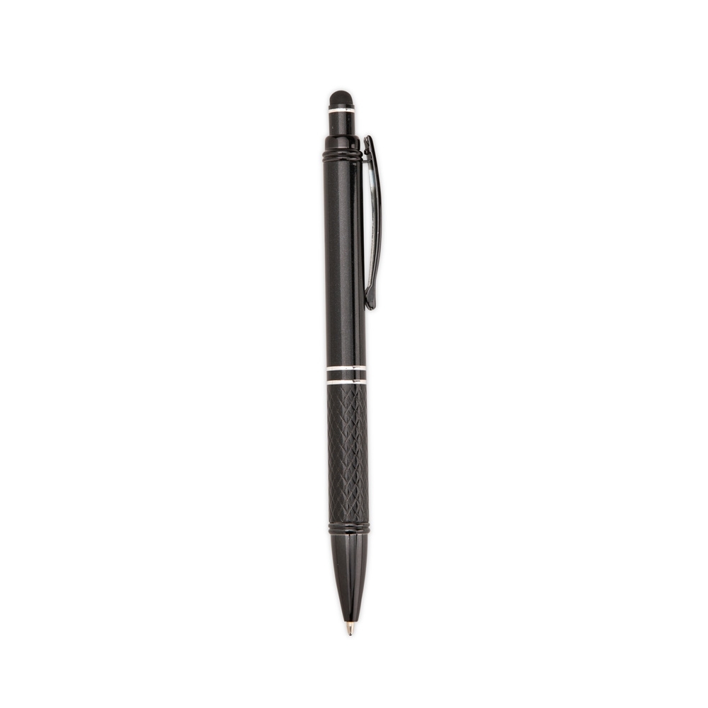 Caneta metálica com ponta e clip em plástico. Possui detalhe emborrachado no topo para interação com dispositivos de telas sensíveis ao toque. Conta ainda com acionamento por clique e carga esferográfica azul de 1,0mm.