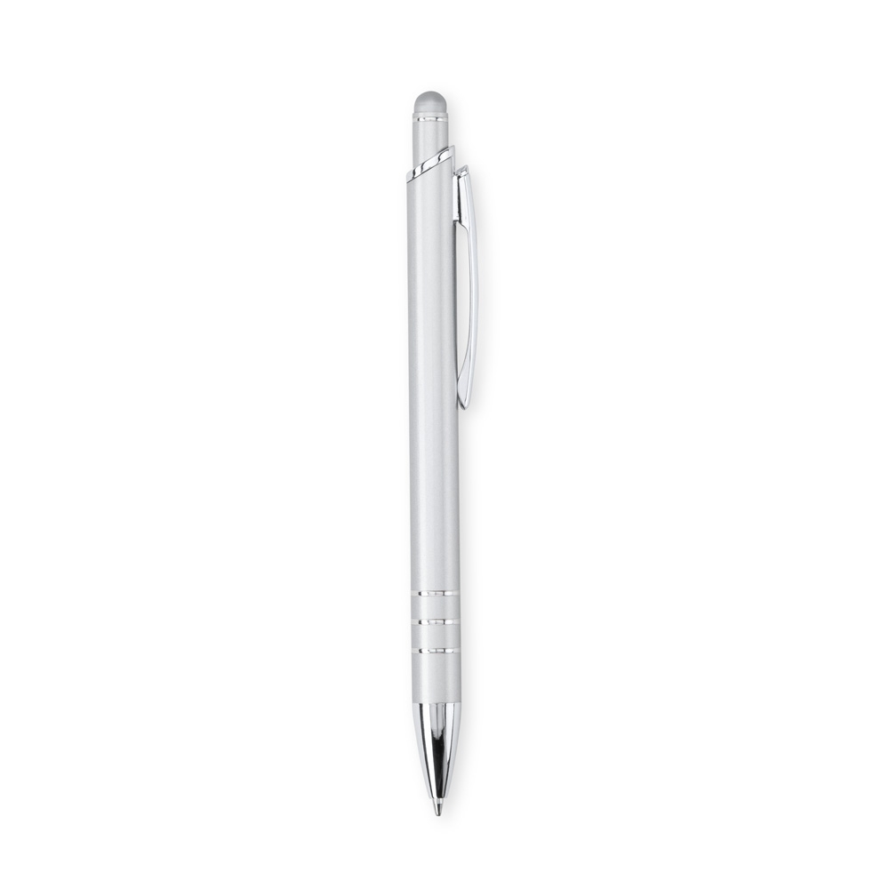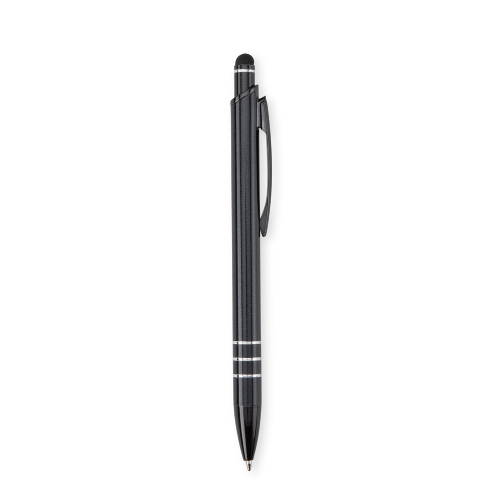 Caneta metálica com ponteira em plástico, além de detalhes na parte inferior com dois anéis prateados e topo emborrachado para interação com dispositivos de telas sensíveis ao toque. Conta com acionamento por clique e carga esferográfica azul de 1,0 mm.
