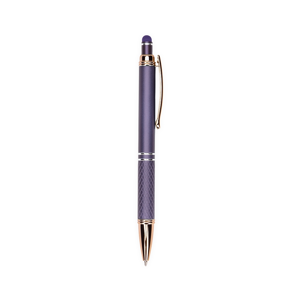 Caneta metálica touchscreen com parte inferior texturizada, acionamento por clique e carga esferográfica azul 1.0mm.